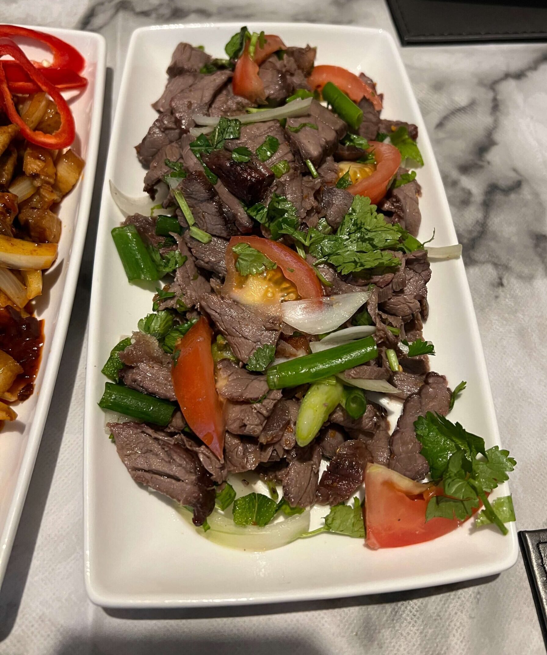 It was a real treat to sit at the table and chat, listen, watch and smell while the menu trial items were being cooked in the kitchen a couple of yards away. The first plate that arrived was chicken bread and spring rolls, with homemade (of course!) sweet chilli sauce. I was honest with the chef, and told her I had never even heard of chicken bread before, let alone tried it. Cracking start. Over the next hour, we were treated to plate after plate of delicious food. All the meals came with fresh vegetables and herbs on the side. We had lettuce wraps to use to pack with beef with red curry paste. A nice mix of cool and warm. Plus coriander, mint, lemongrass and spring onions, alongside portions of chicken wings, chicken green curry and a belly pork salad. My mouth and taste buds went through a whole array of feelings from spicy to hot to cool and fresh.