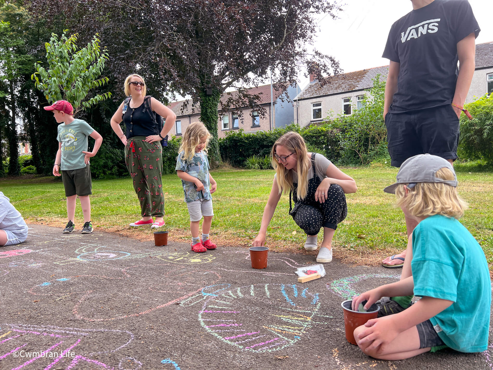 Dozens of children had fun today creating a huge piece of chalk art in Oakfield Flower Gardens.