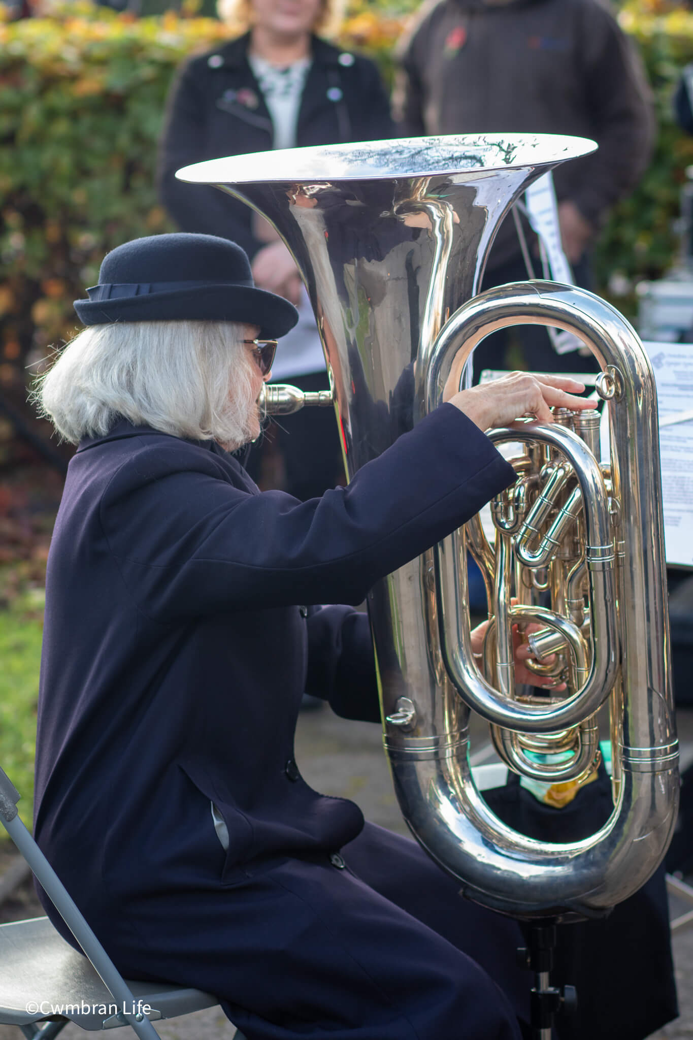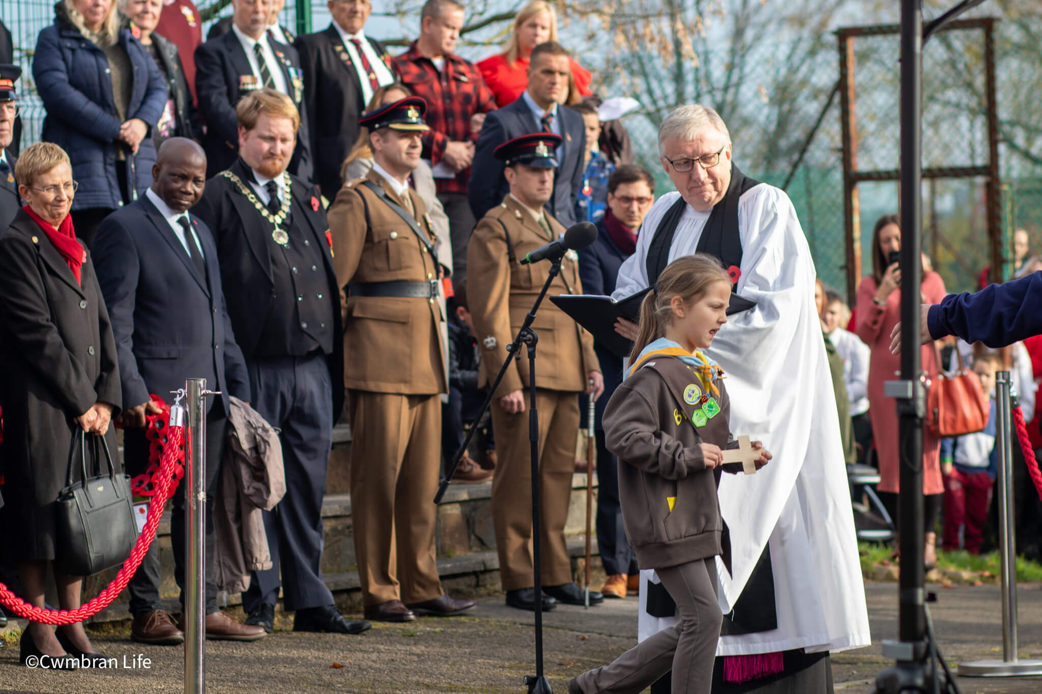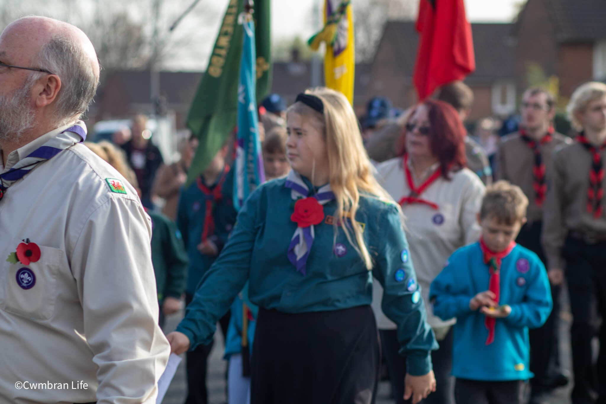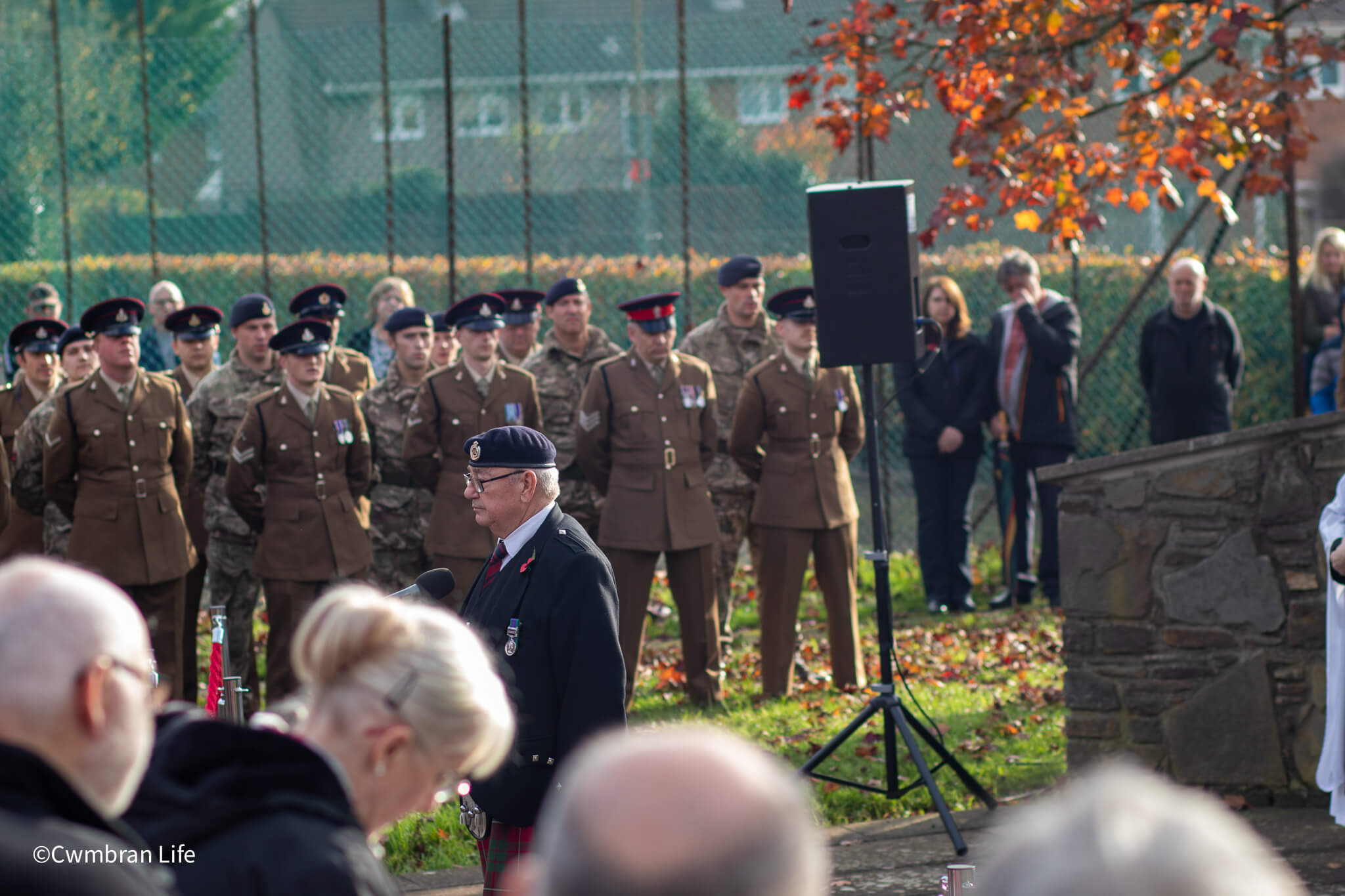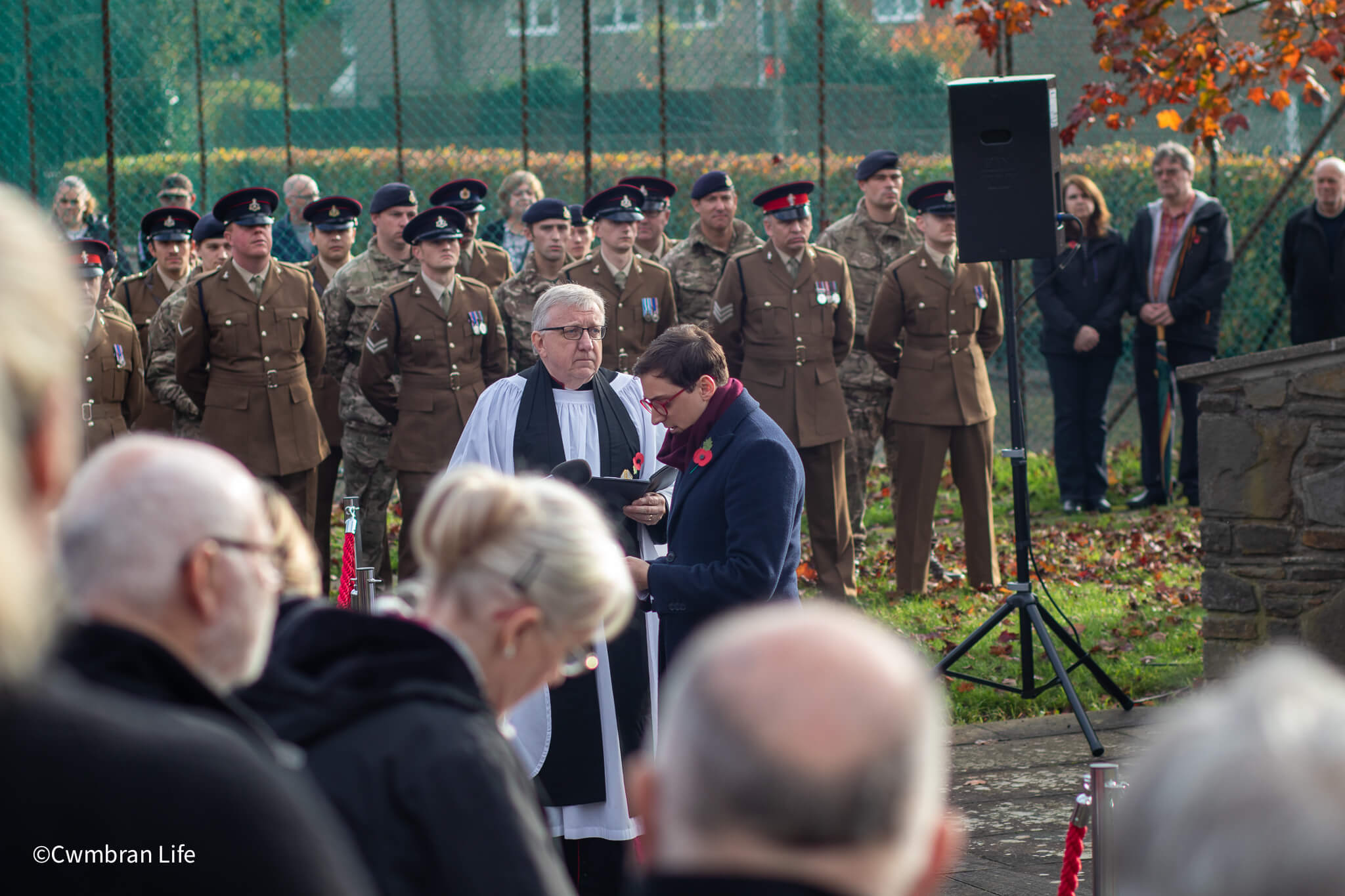 The group marched along Wesley Street to the sounds of a bagpiper and formed around the War Memorial in Cwmbran Park. Crowds stood inside the park and along Henllys Way to watch the service, prayers and laying of wreaths. The Last Post was played followed by a two-minute silence.
