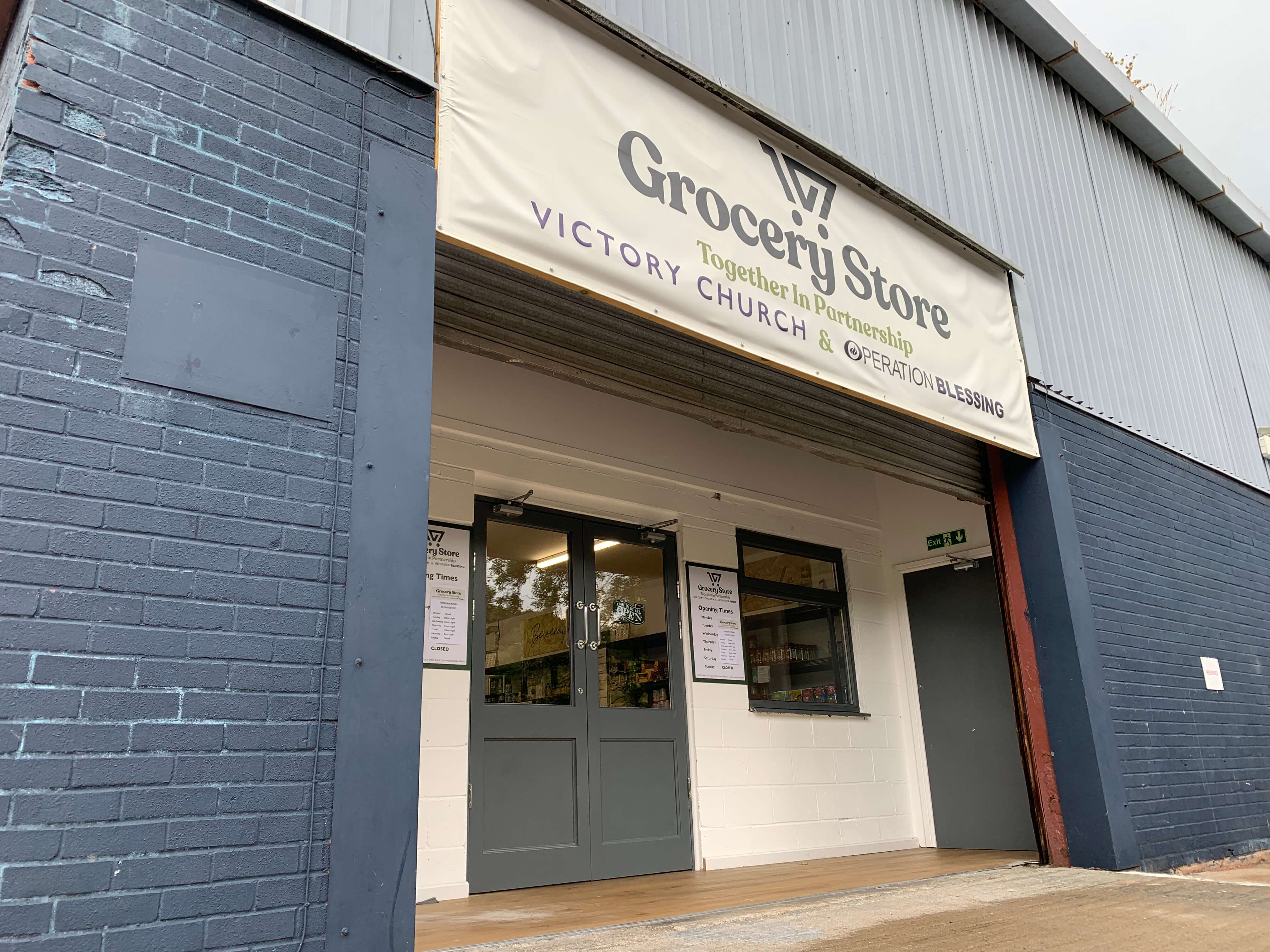 Pastor Clyde Thomas and Matthew outside the new Grocery Store at Victory Church in Cwmbran