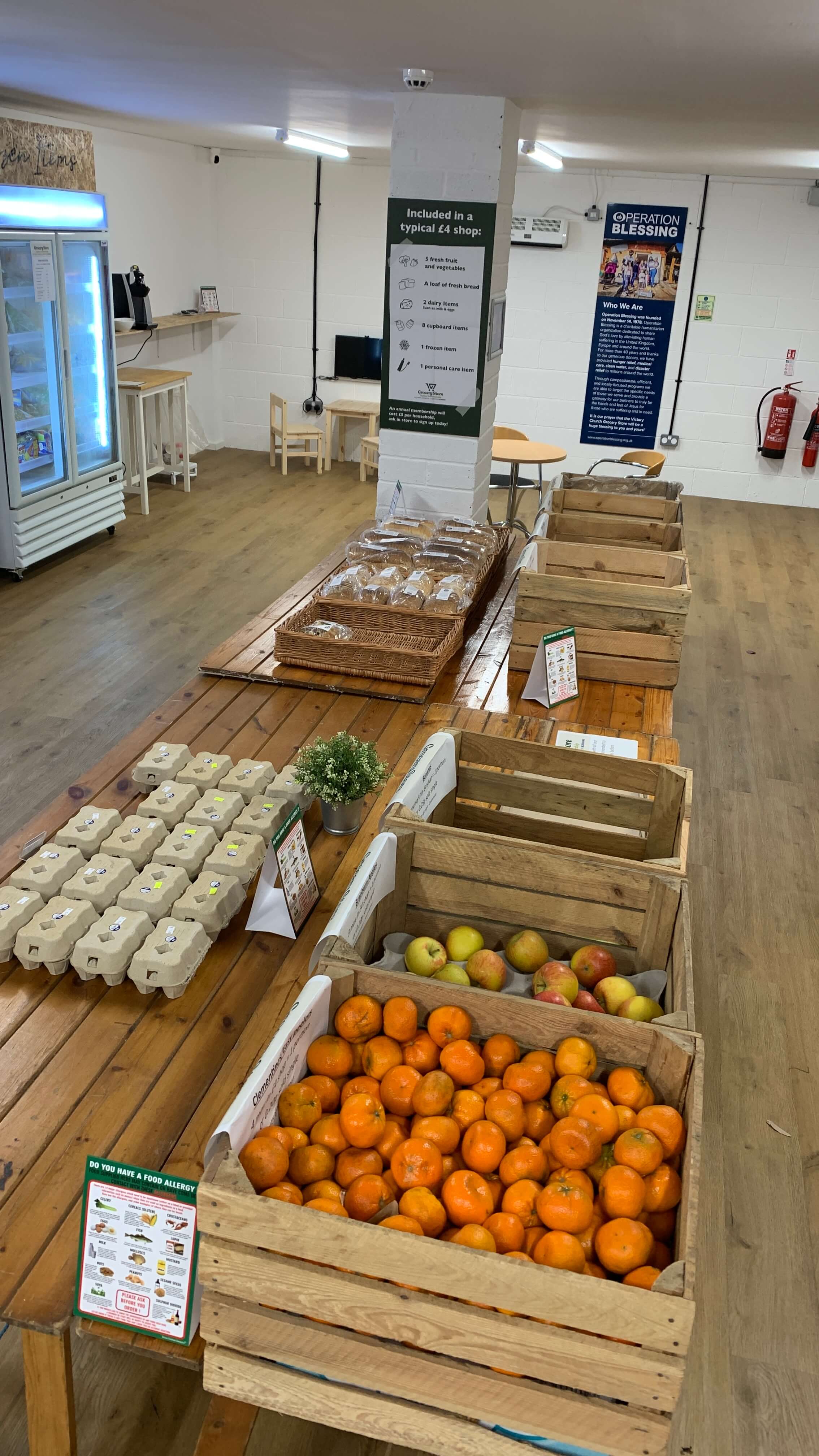 As there is no criteria for membership he wants any families who want to save money to become members. The shop is well laid-out with wooden crates of fruit and veg running down the middle aisle. Some items like butter and cheese aren’t included but can be bought at the till.