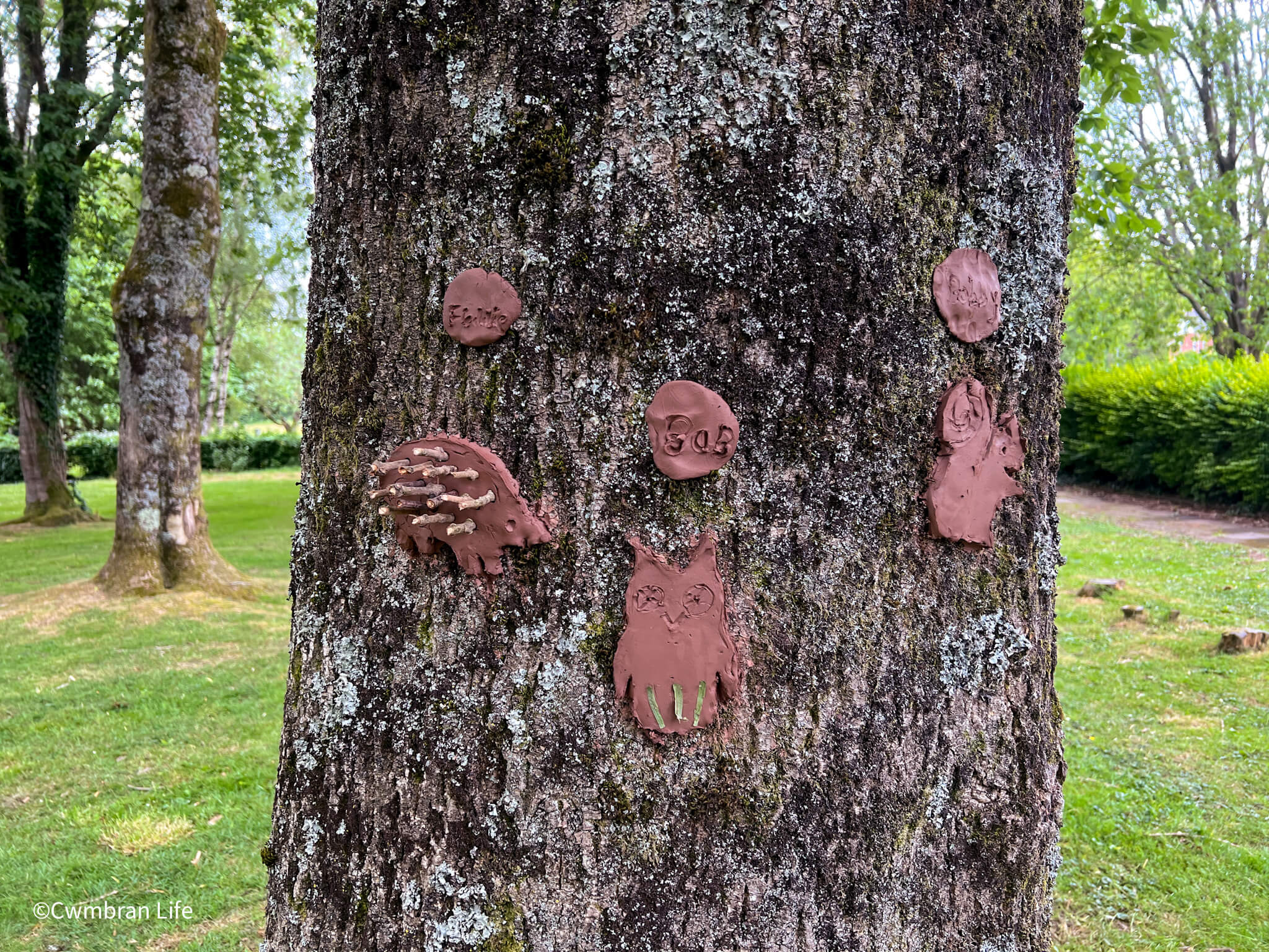 Following the chalk art, Tom gave the groups clay and sticks and they created animals including owls, hedgehogs and squirrels. Their art has been placed on trees in the park. Look out for them on your next visit.