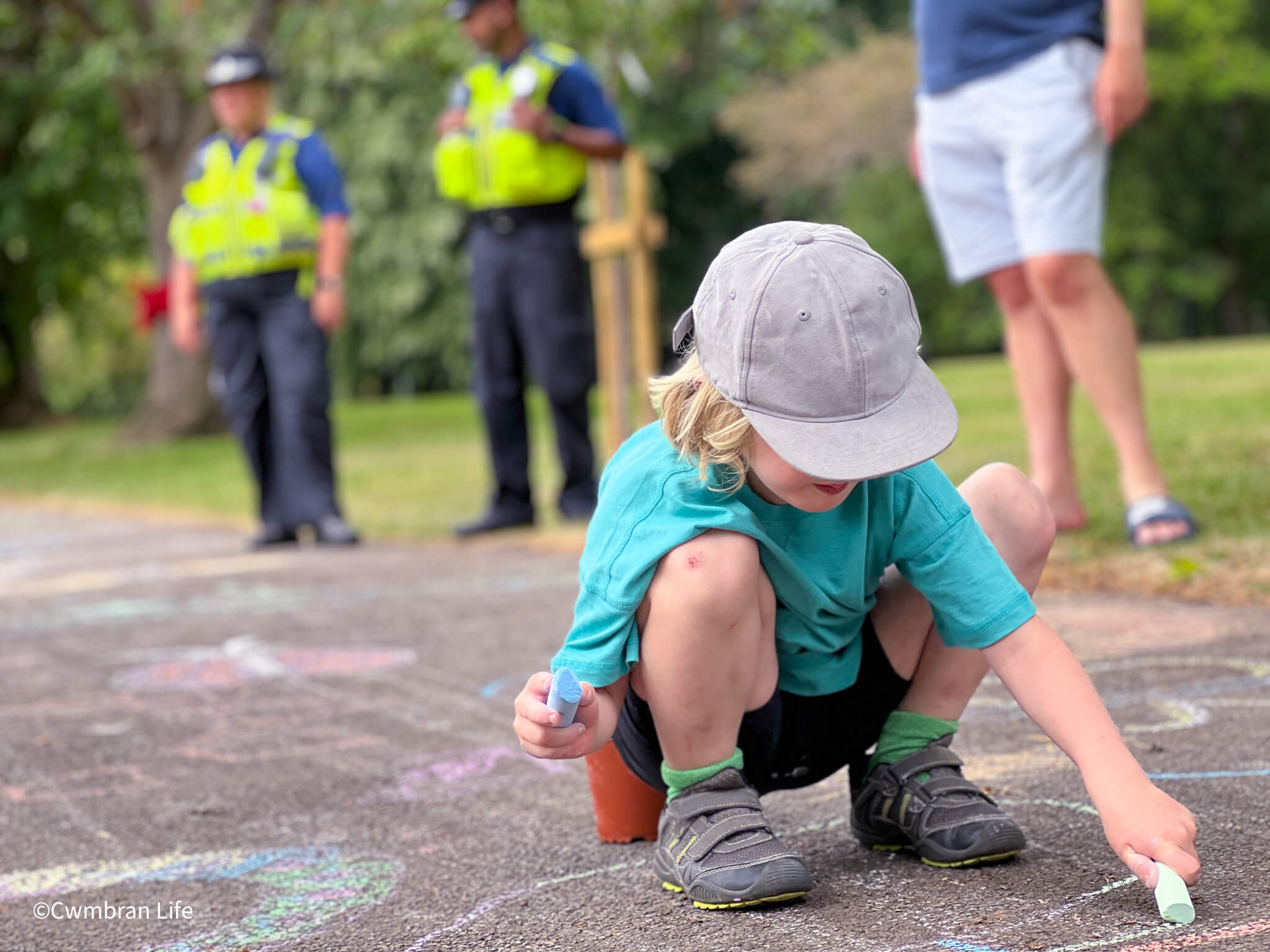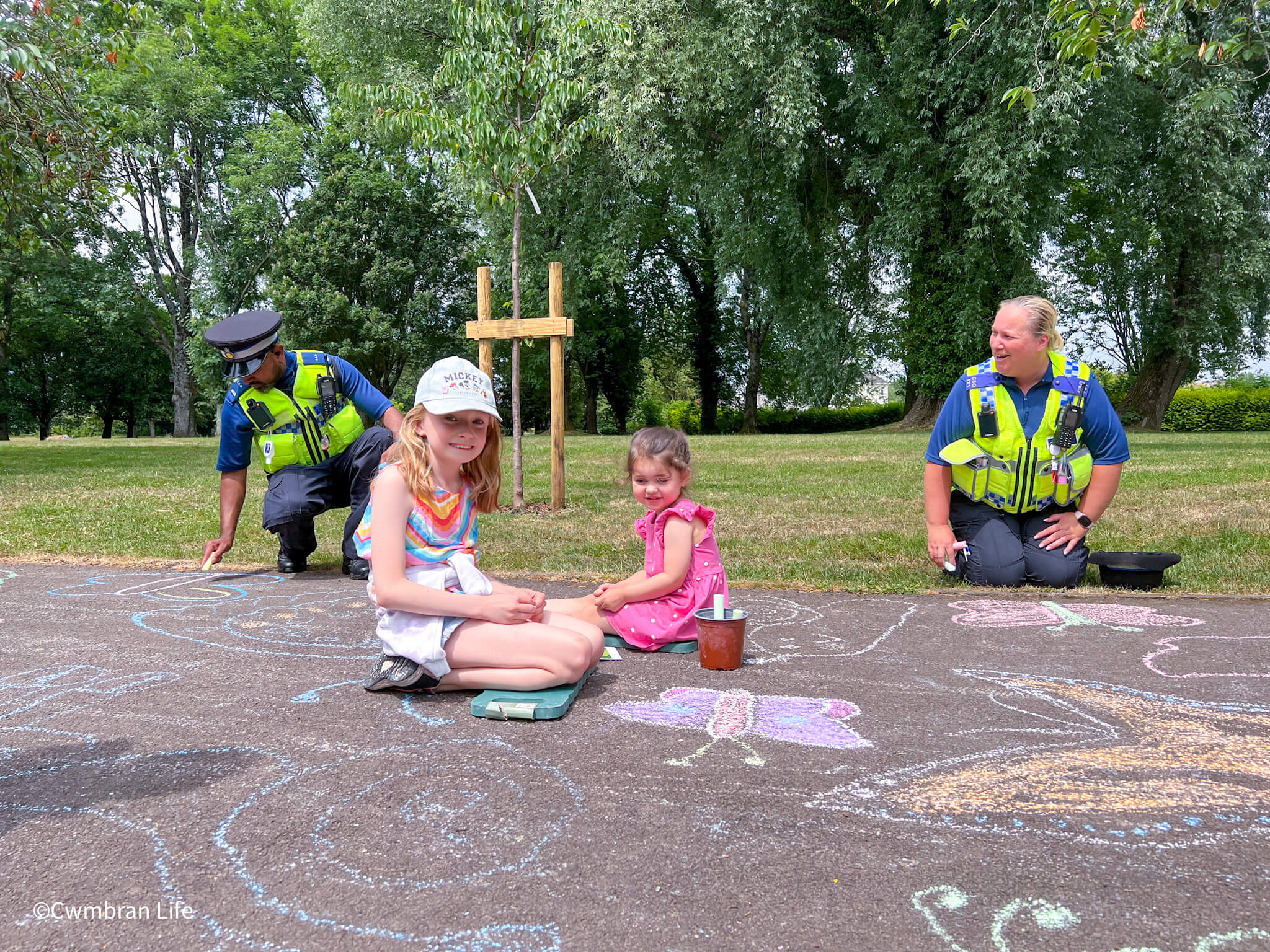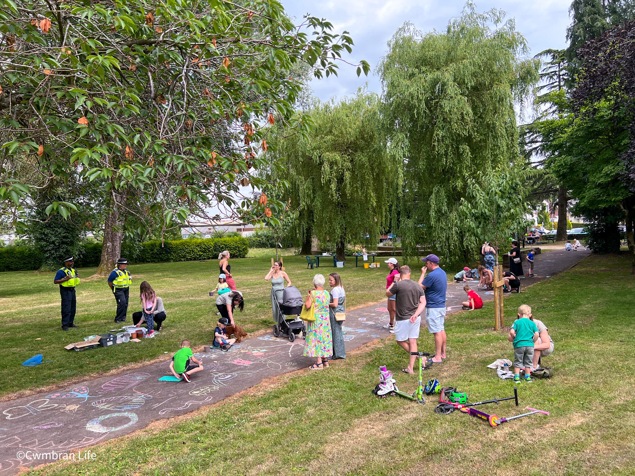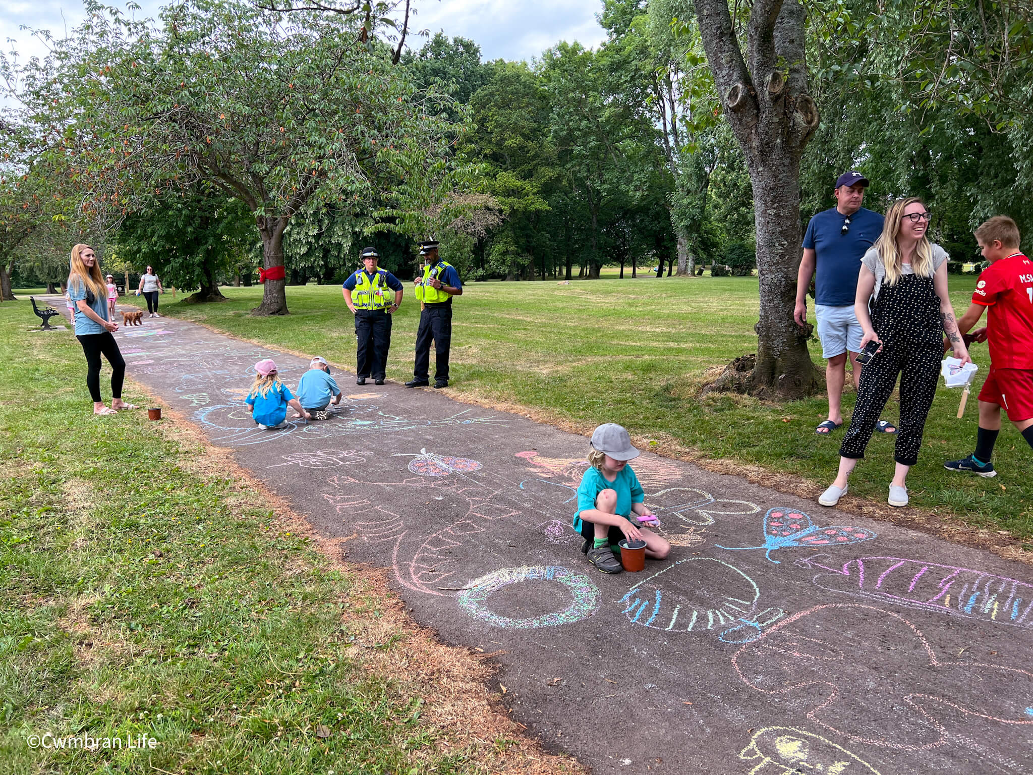 They took part in an Art in the Park event, organised by Llarcs (Llantarnam Residents Conservation Society). Artist Tom Maloney encouraged children to draw bugs and insects in chalk along one of the long paths through the park. This is a quick video of the path after the first session, before the second group made it even longer in the afternoon. It’s a stunning, colourful stretch of creative art made by children.