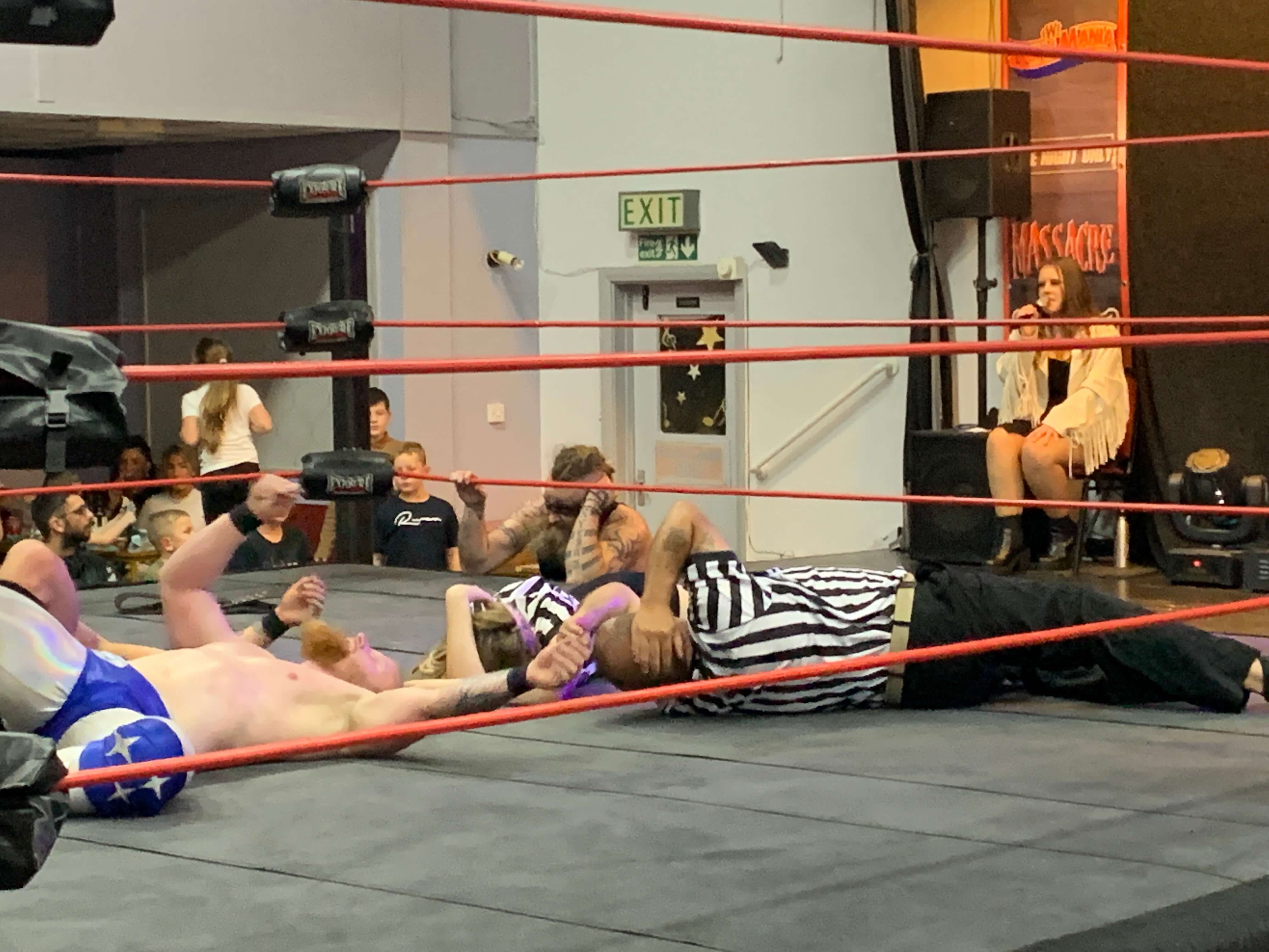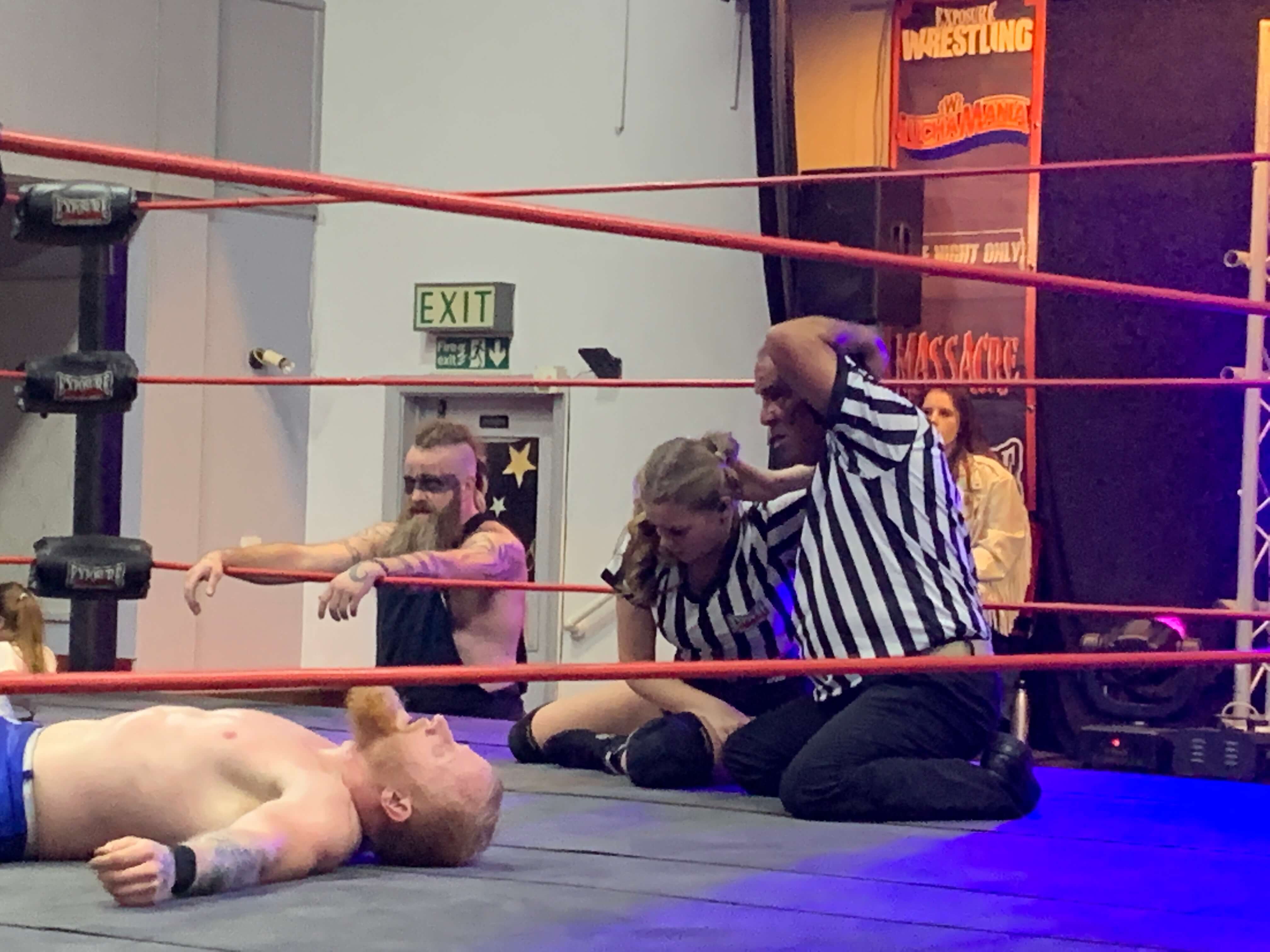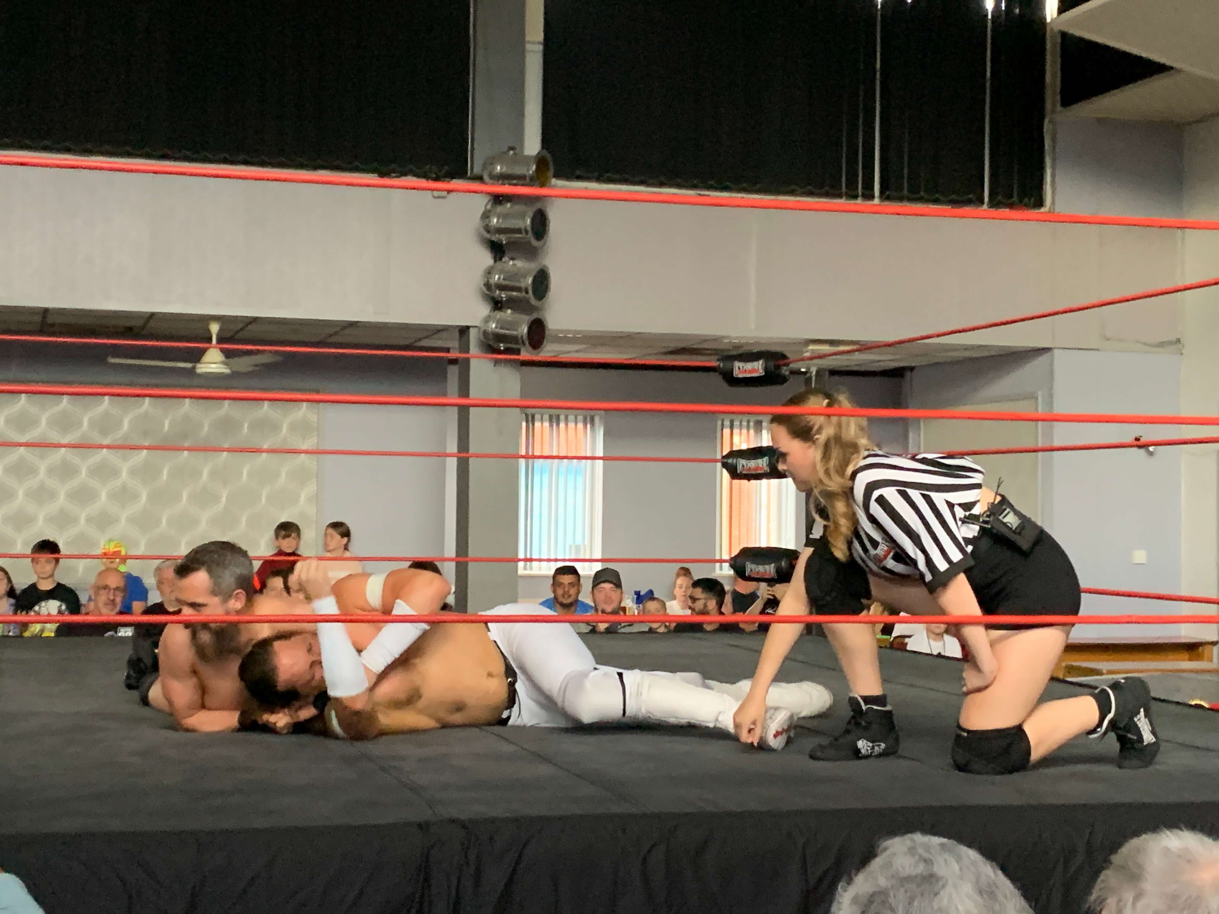 Sixteen-year-old Tilly Gordon has featured on Cwmbran Life a few times this year. The former Cwmbran High School pupil wants to be a professional wrestler. This year she has been building up her skills and experience in the gym and being put in the spotlight as a referee on several shows. Tonight was no different and she found herself in the middle of two bouts and finding herself called up for a third by the crowd after Chris, the referee in the final bout, was ‘knocked out’ following a clash in the C.J. Rawlings v Jack Stars bout. This led to the dramatic finale of the night. Jack had C.J pinned down and as Tilly was counting to three, CJ’s teammate sneaked into the ring and landed a strike to her head and this stopped the count. Chris recovered moments later to see C.J back in control and awarded him the win in controversial circumstances.