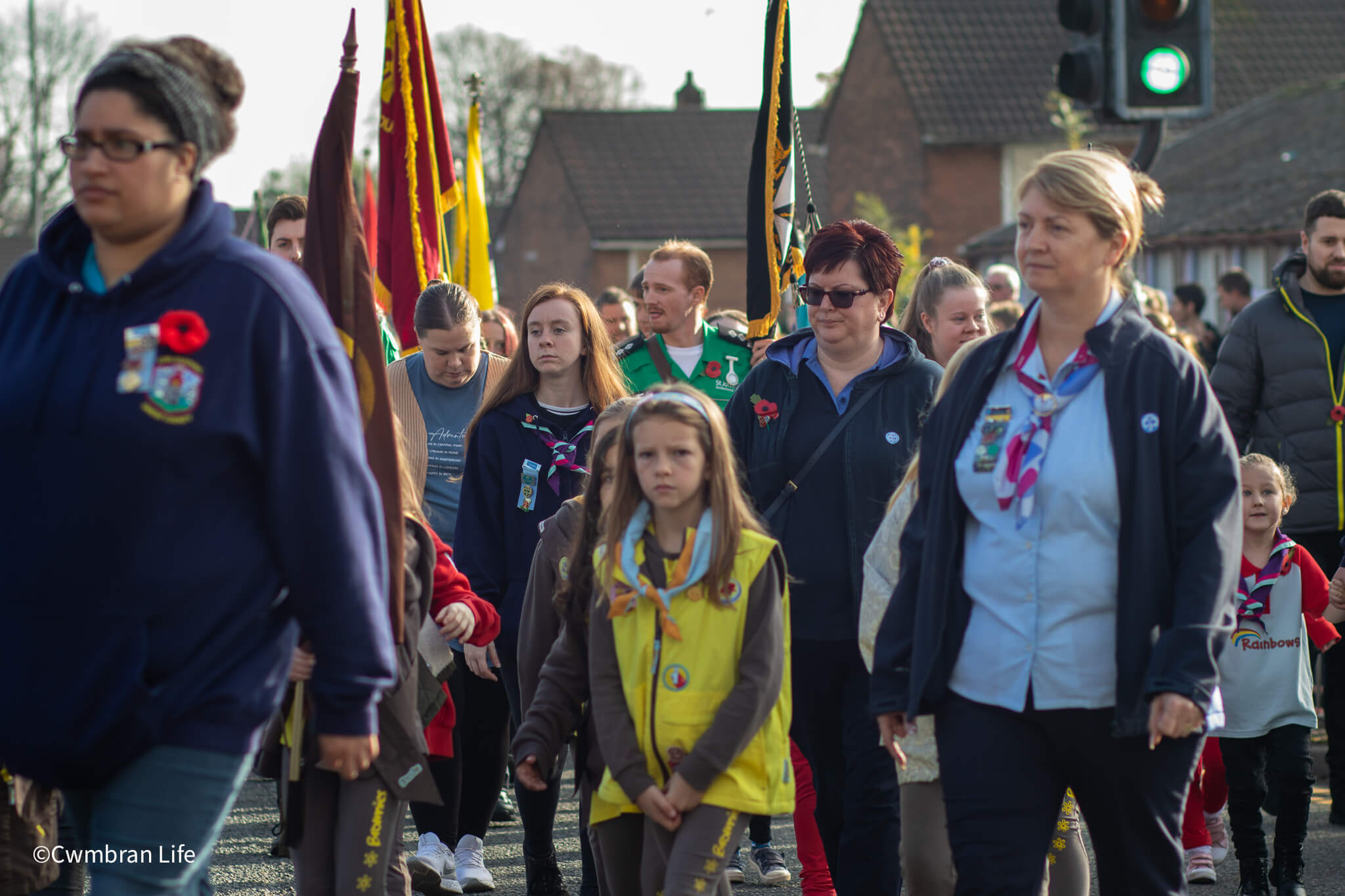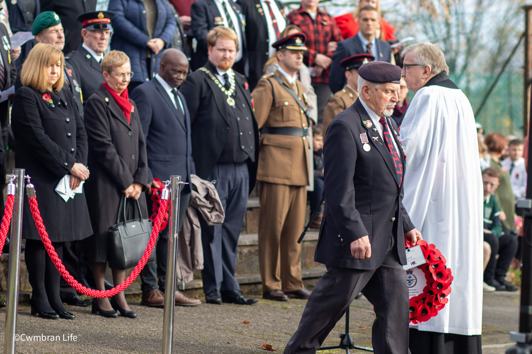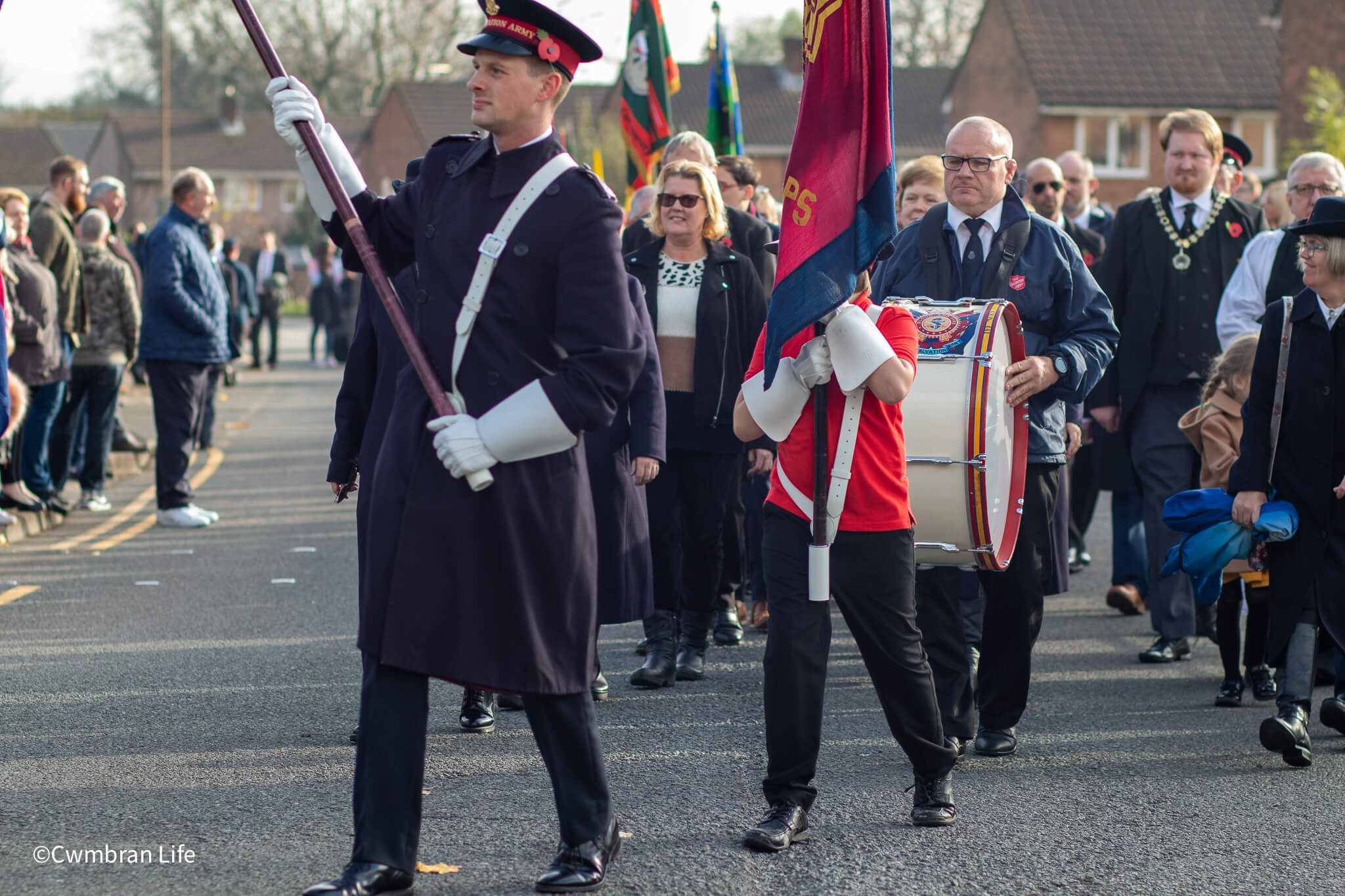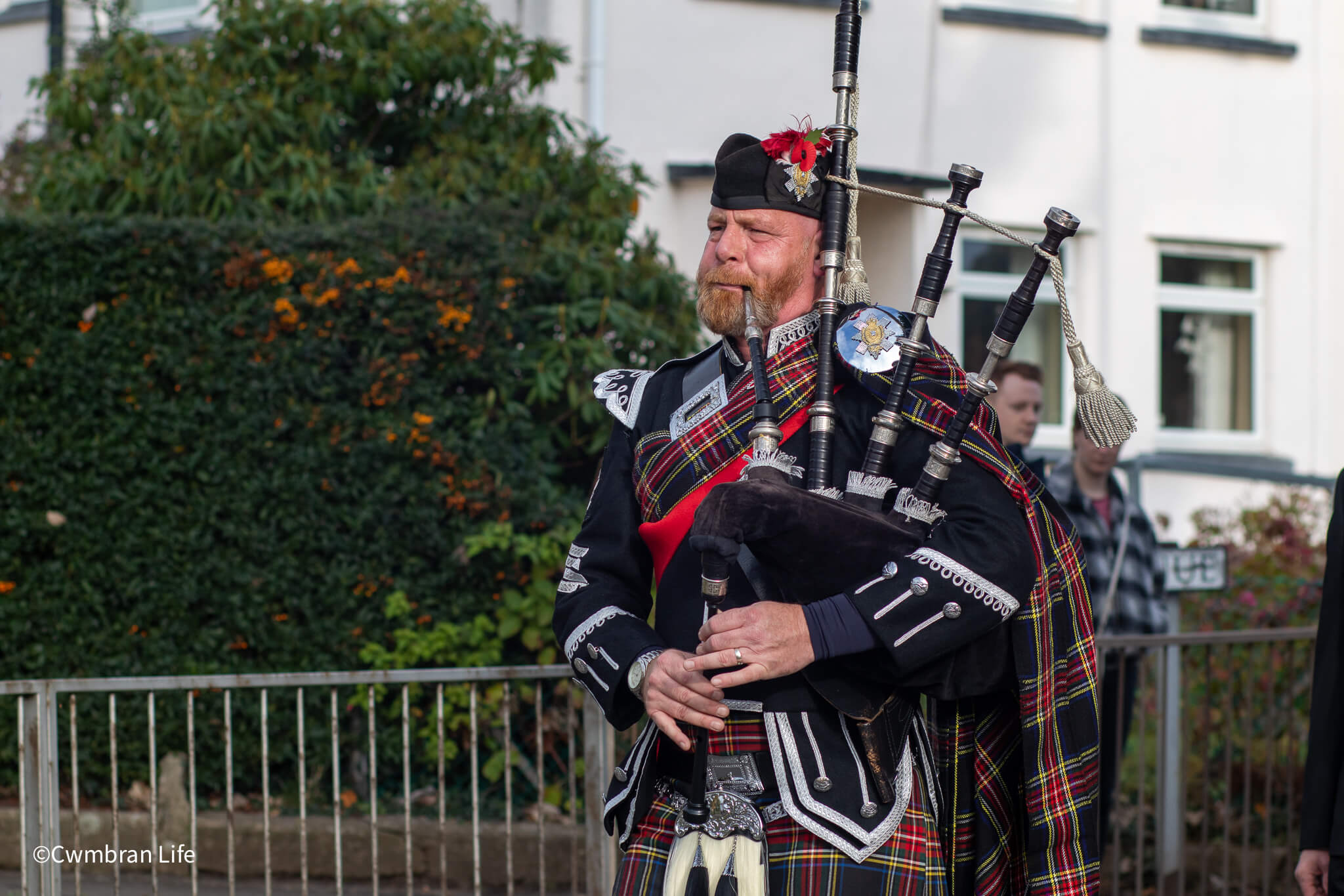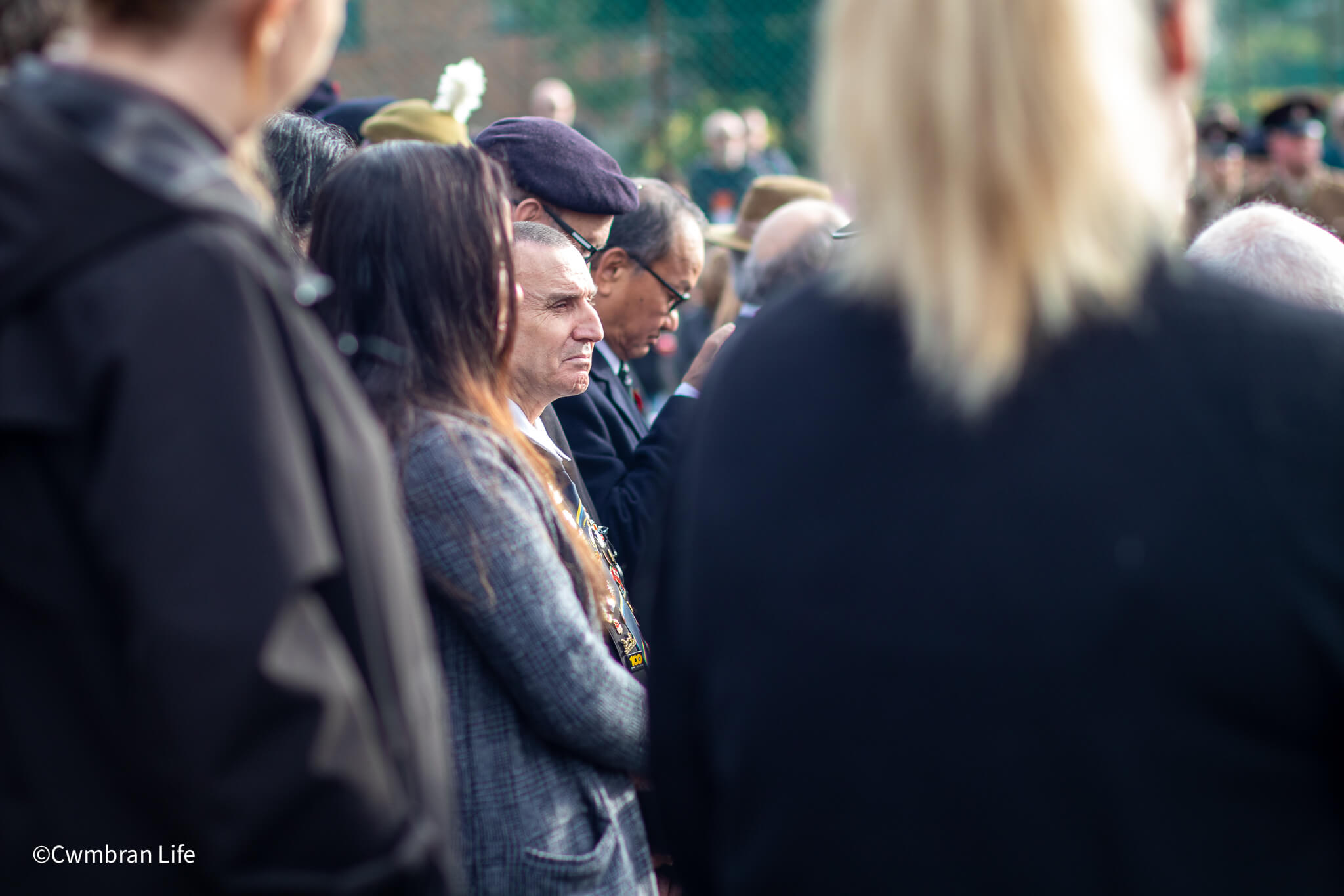 The group marched along Wesley Street to the sounds of a bagpiper and formed around the War Memorial in Cwmbran Park. Crowds stood inside the park and along Henllys Way to watch the service, prayers and laying of wreaths. The Last Post was played followed by a two-minute silence.