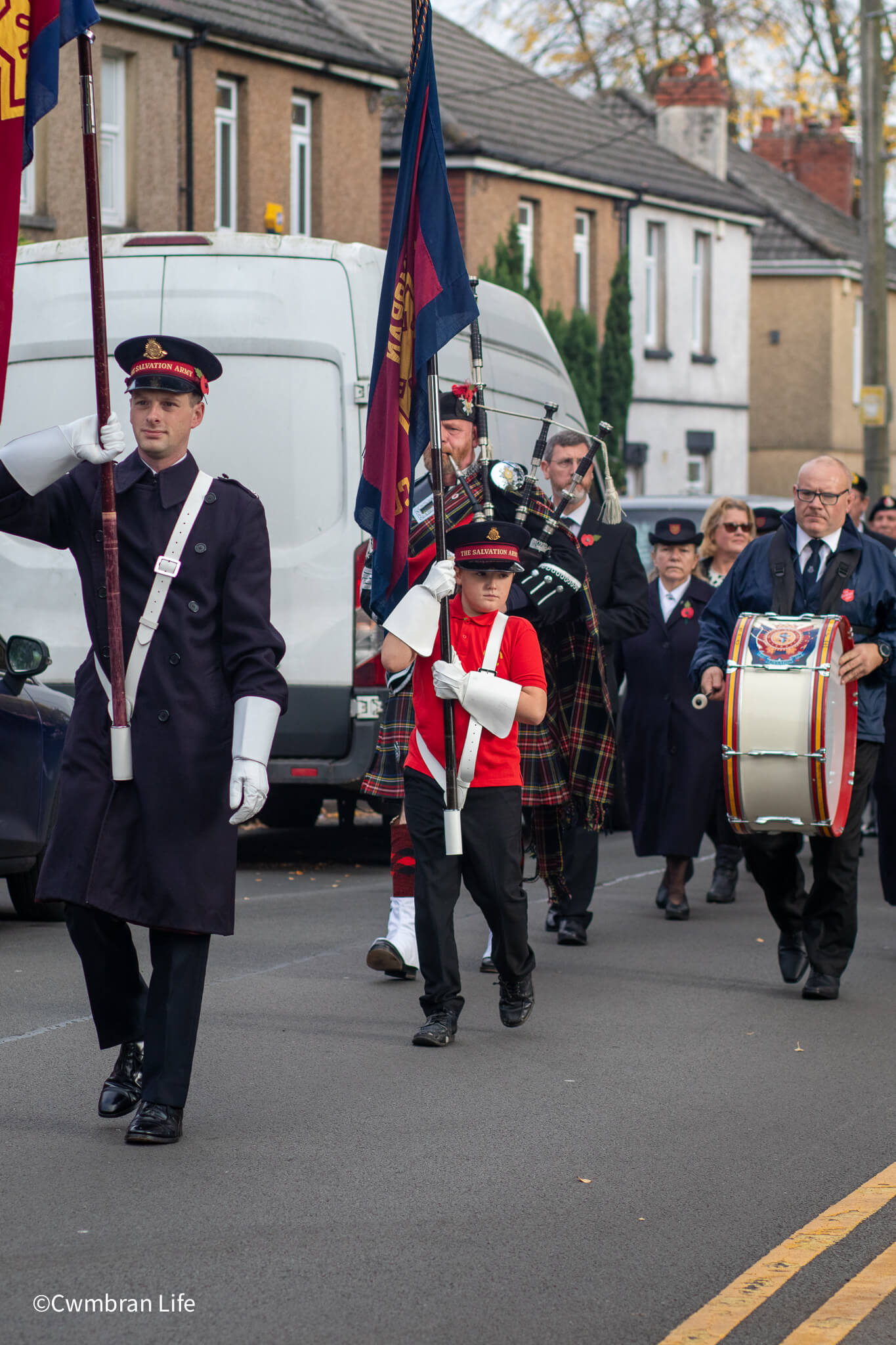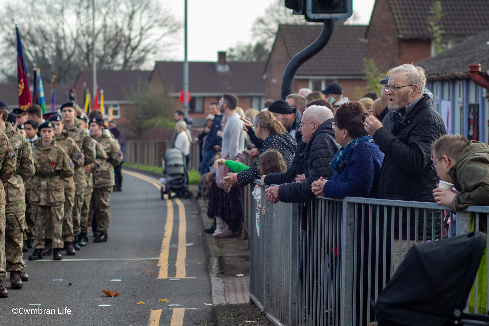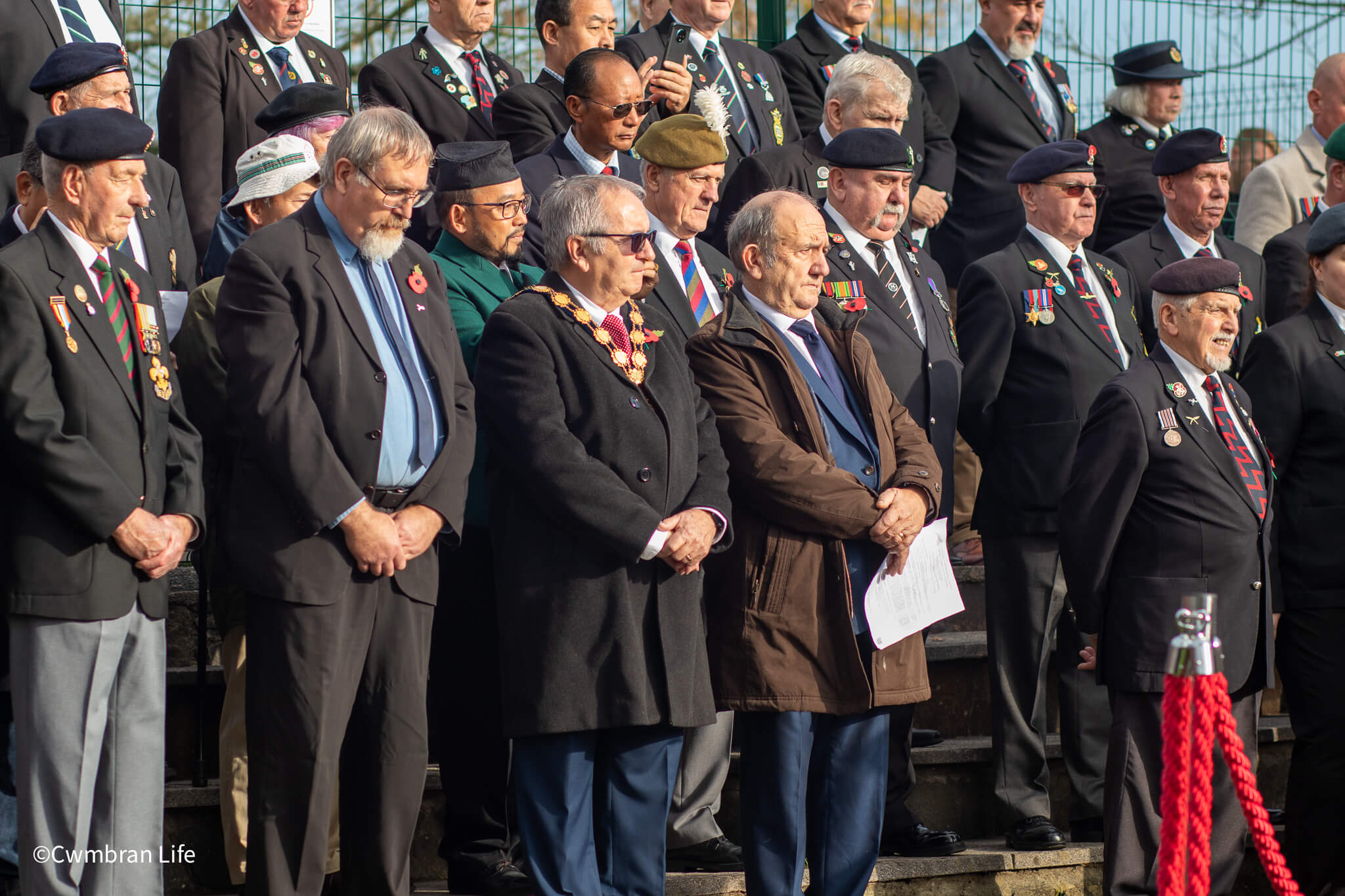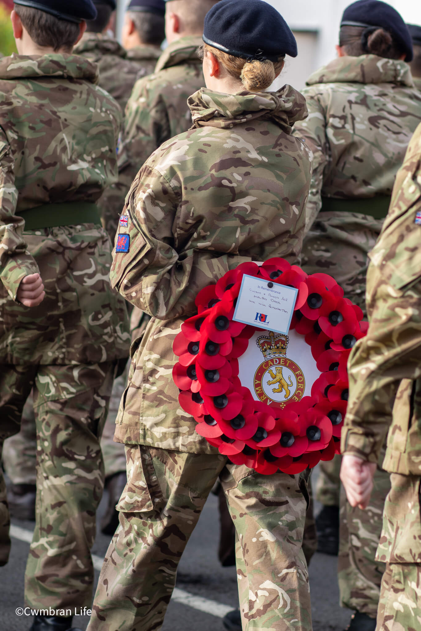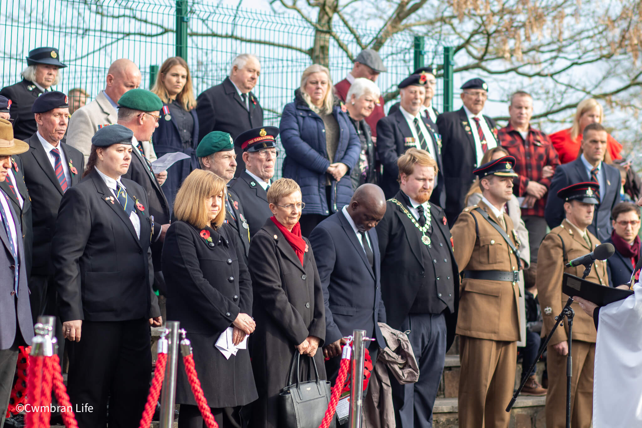 The group marched along Wesley Street to the sounds of a bagpiper and formed around the War Memorial in Cwmbran Park. Crowds stood inside the park and along Henllys Way to watch the service, prayers and laying of wreaths. The Last Post was played followed by a two-minute silence.