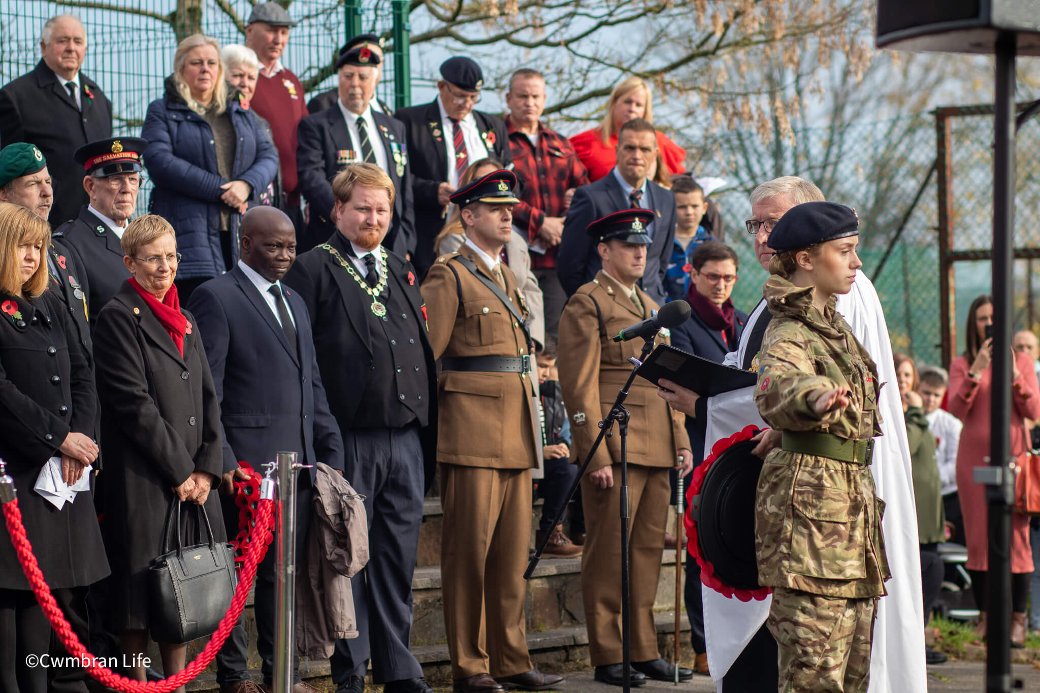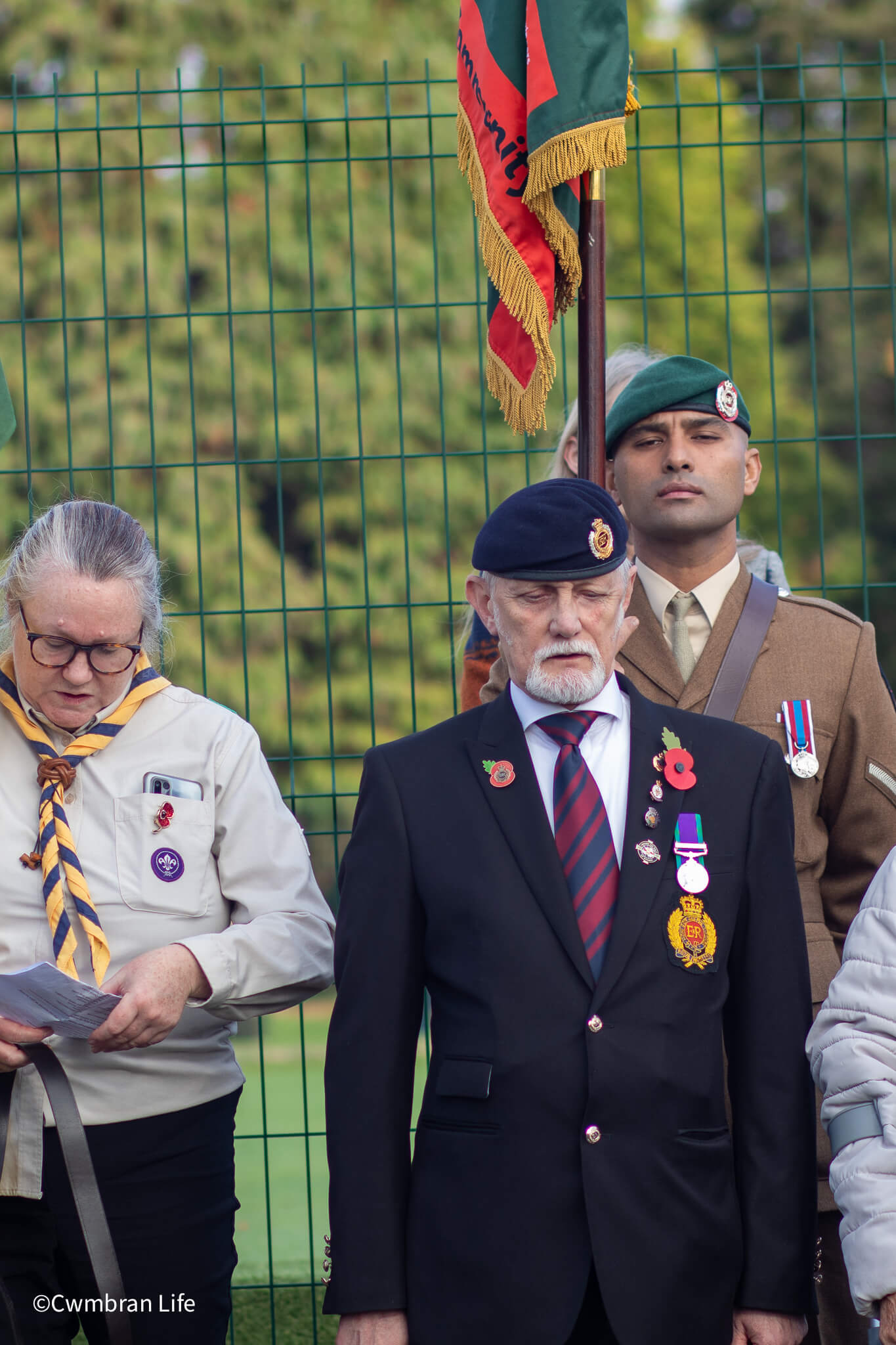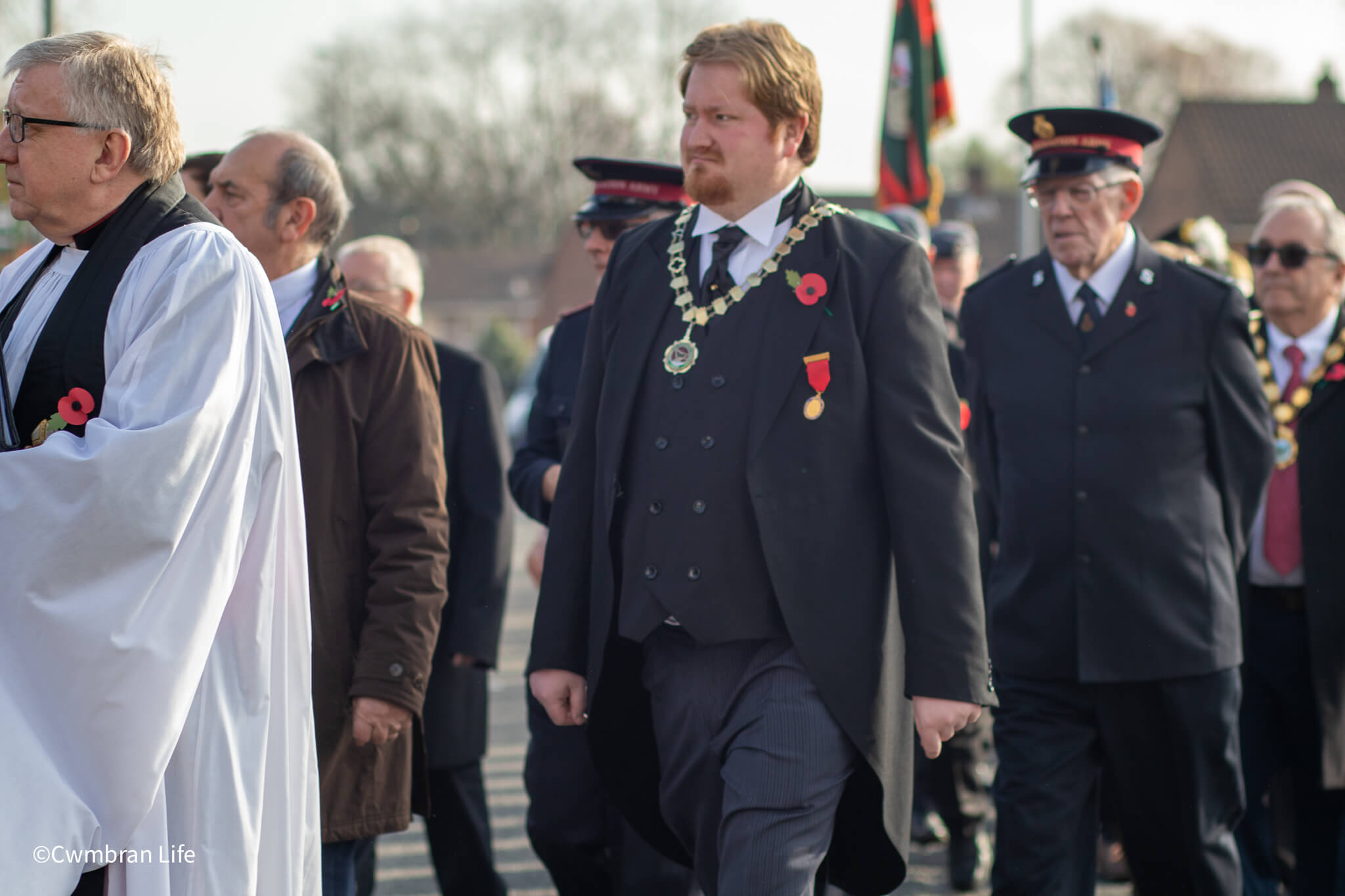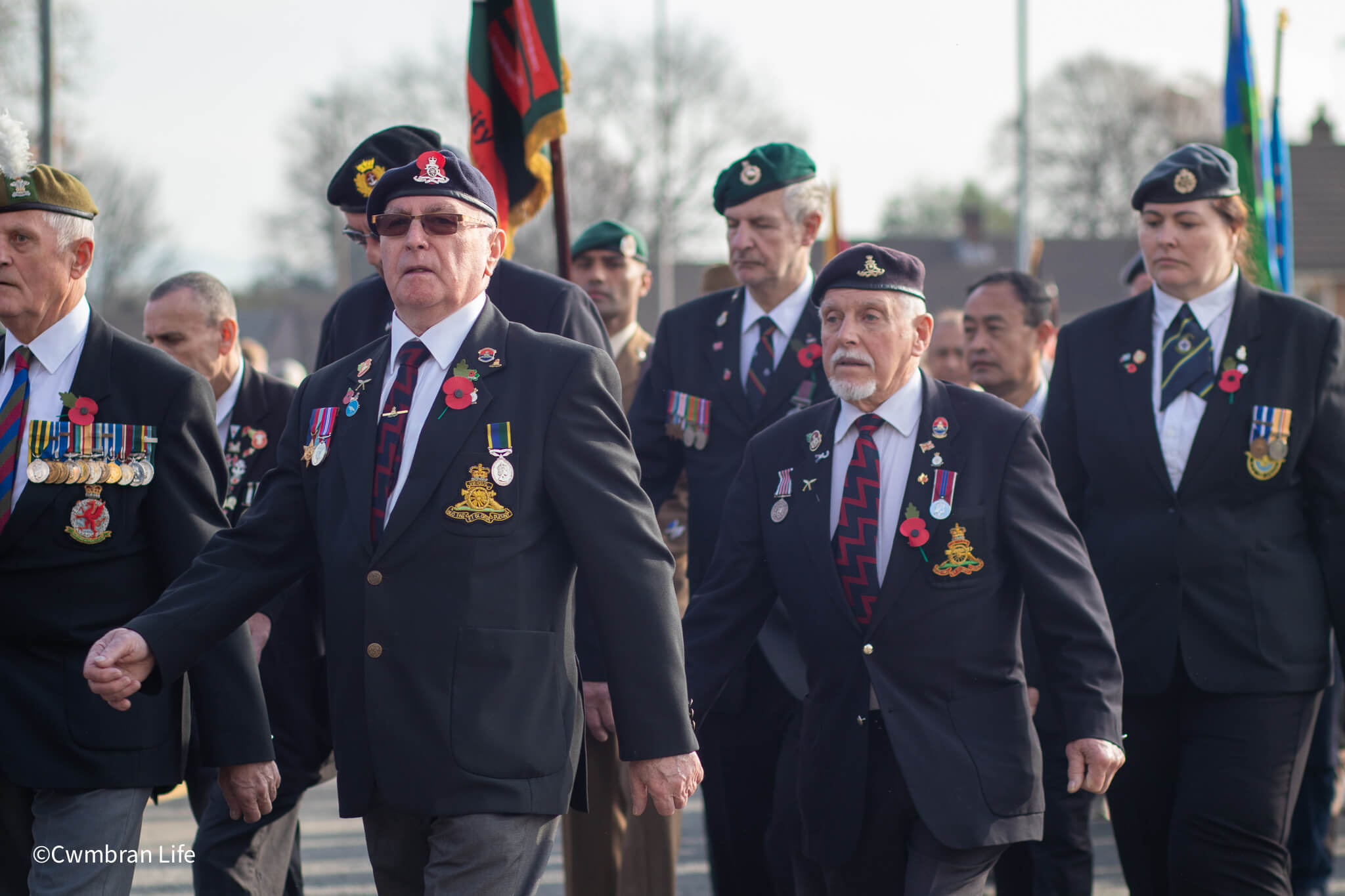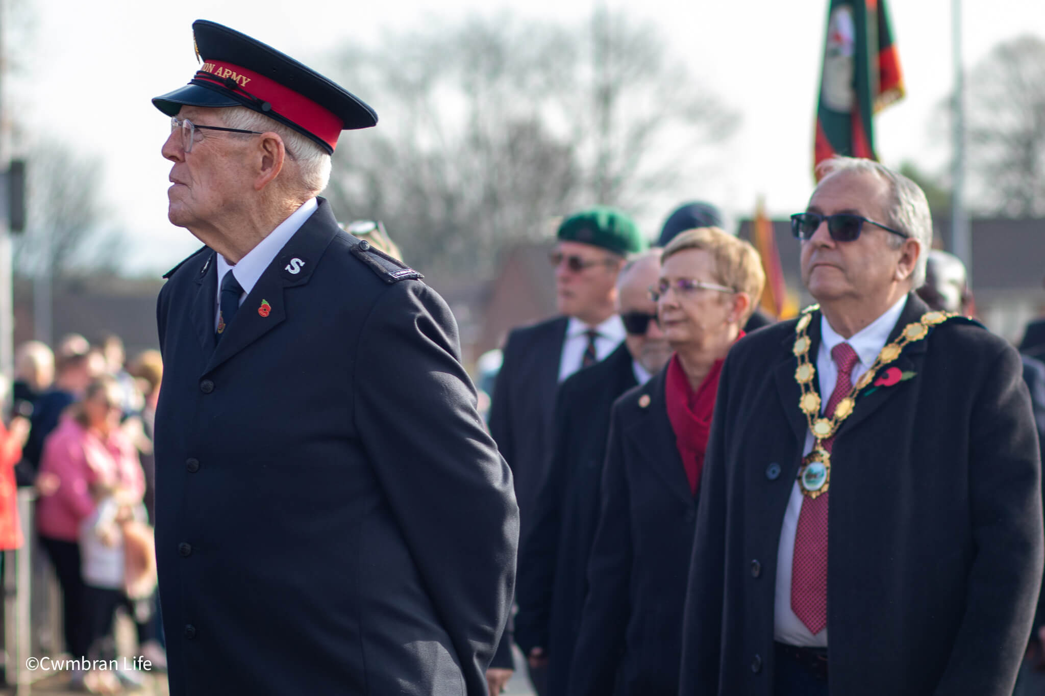 The group marched along Wesley Street to the sounds of a bagpiper and formed around the War Memorial in Cwmbran Park. Crowds stood inside the park and along Henllys Way to watch the service, prayers and laying of wreaths. The Last Post was played followed by a two-minute silence.