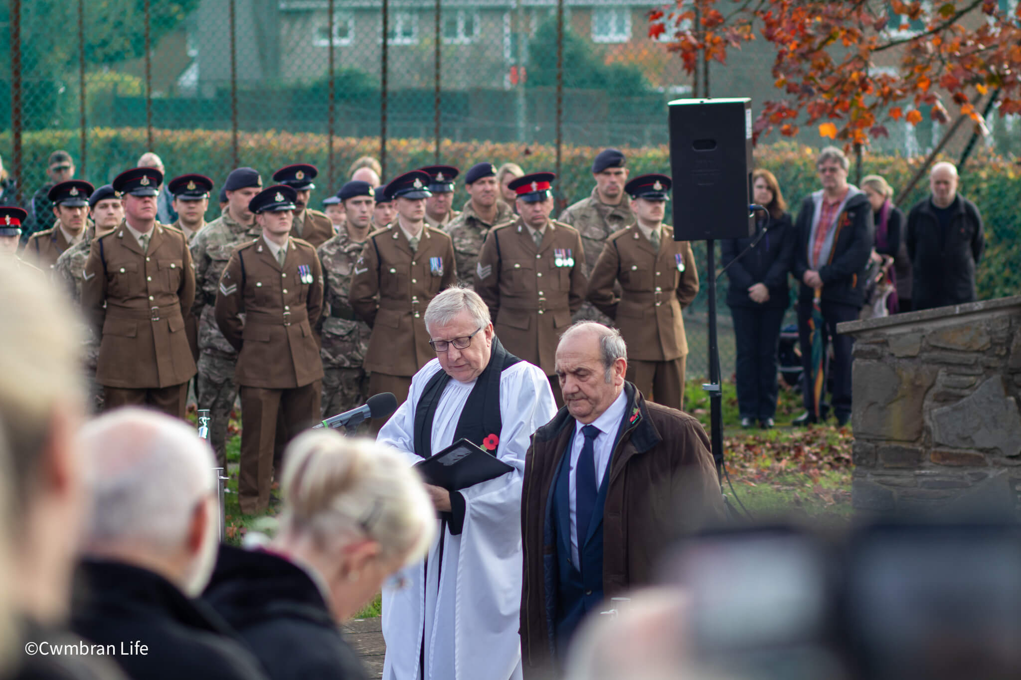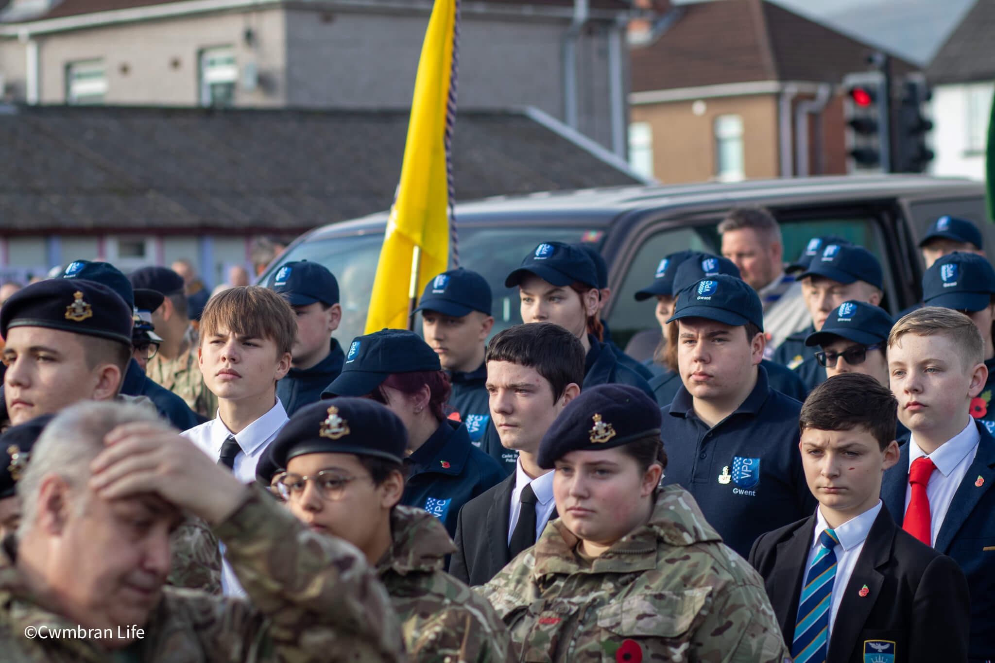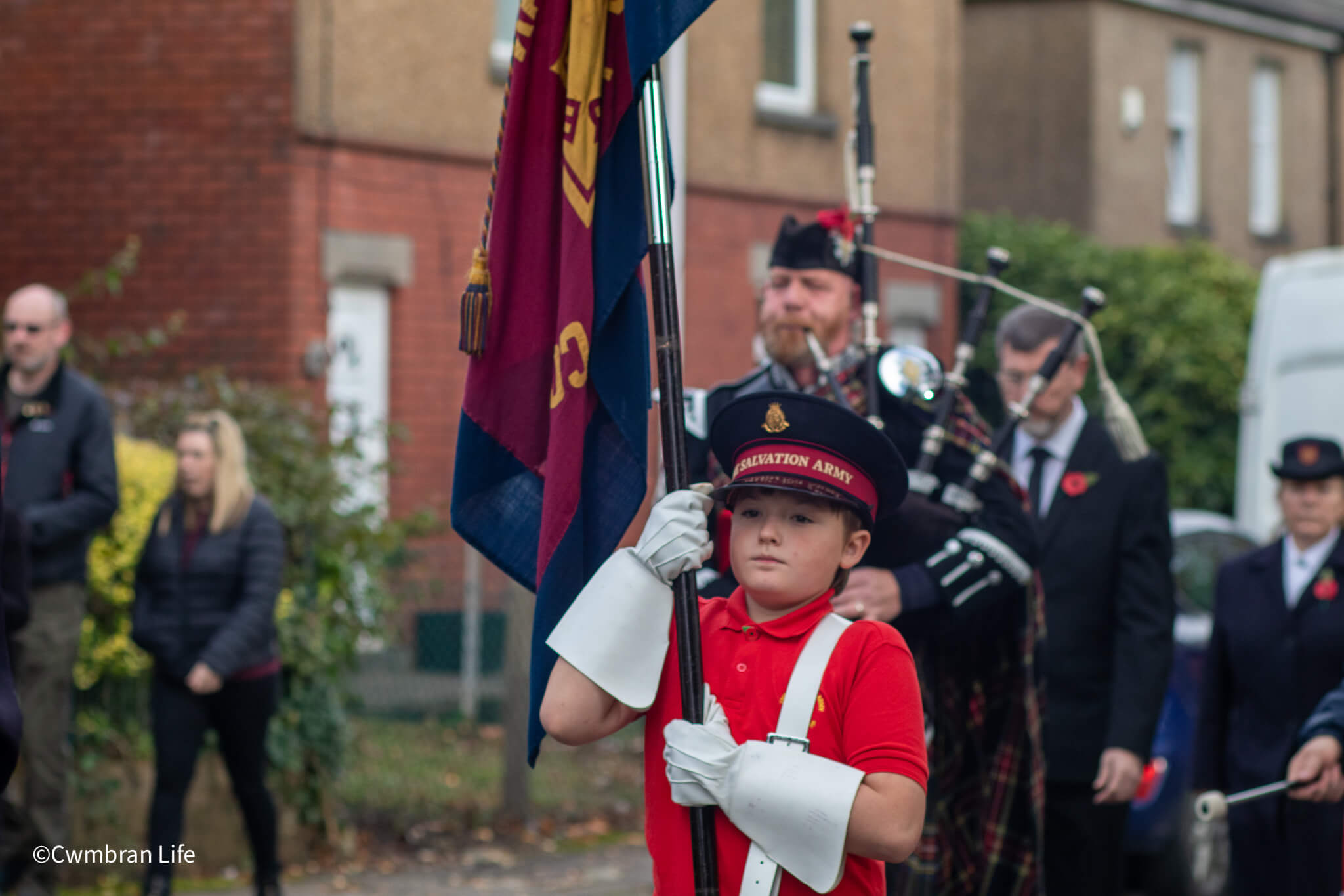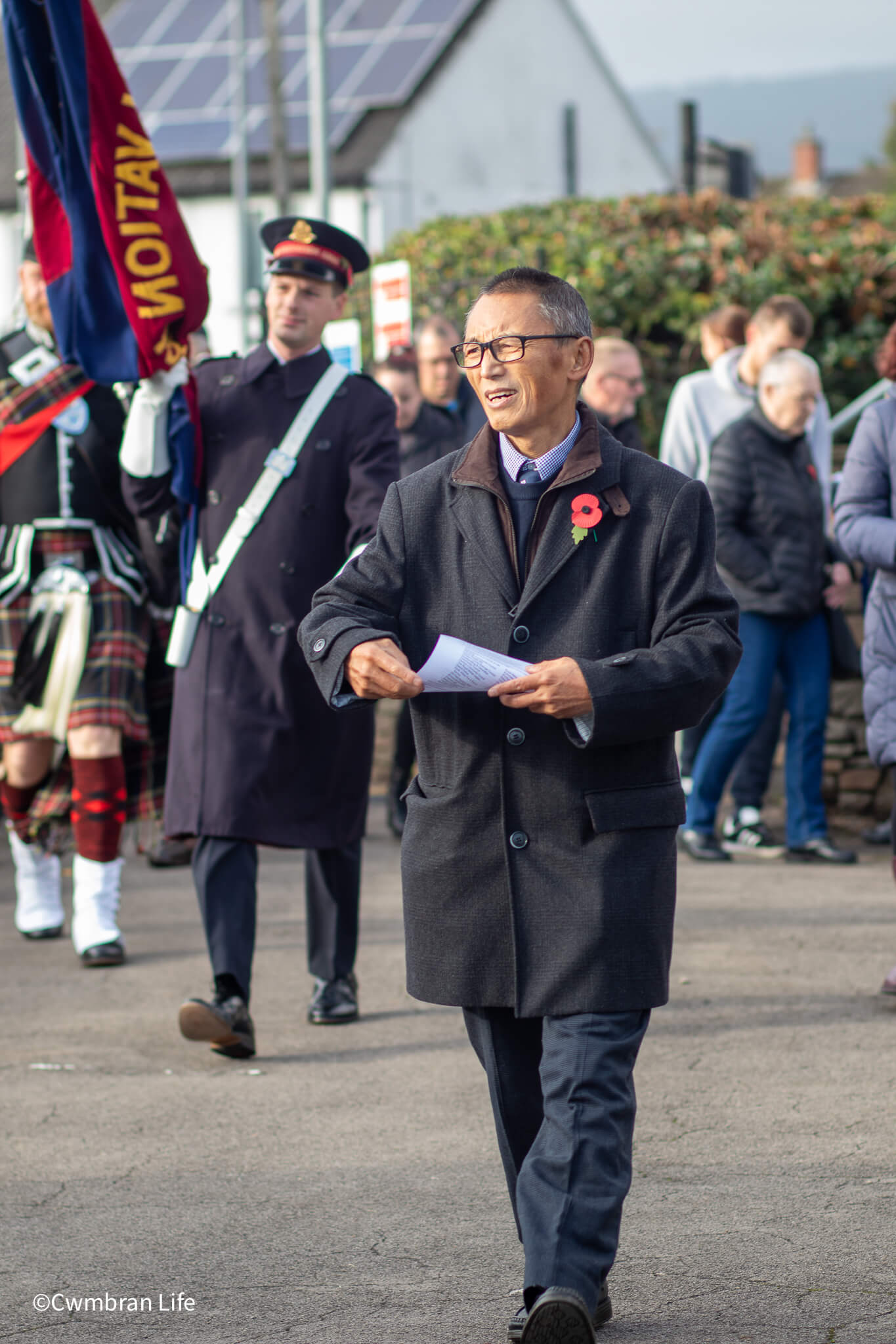 The group marched along Wesley Street to the sounds of a bagpiper and formed around the War Memorial in Cwmbran Park. Crowds stood inside the park and along Henllys Way to watch the service, prayers and laying of wreaths. The Last Post was played followed by a two-minute silence.