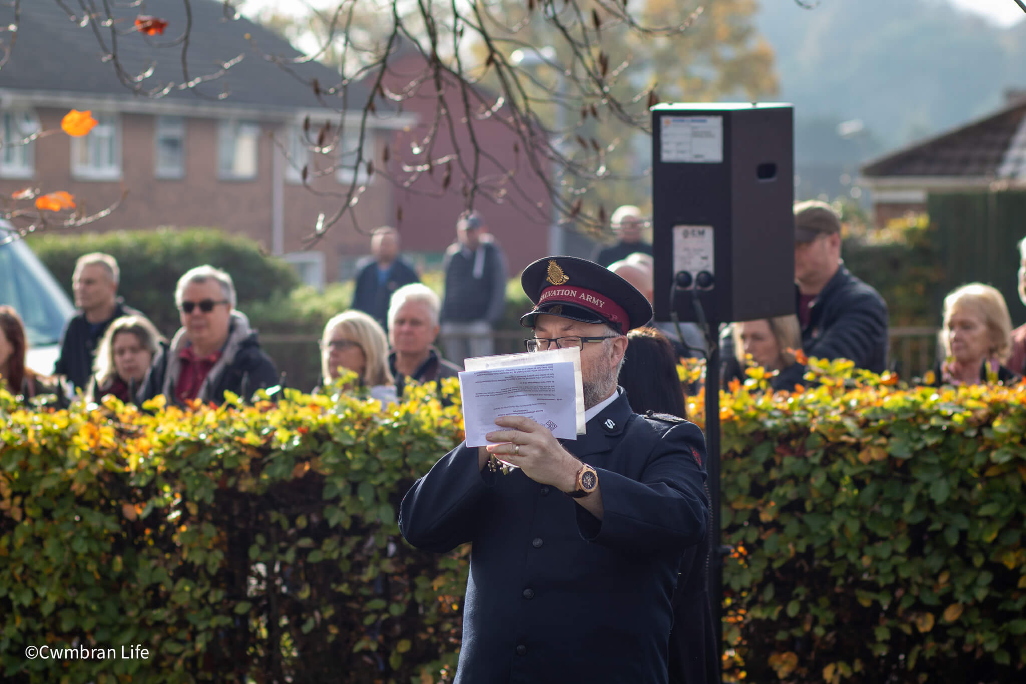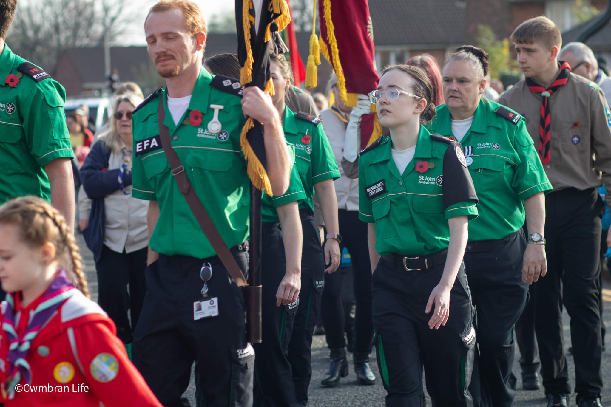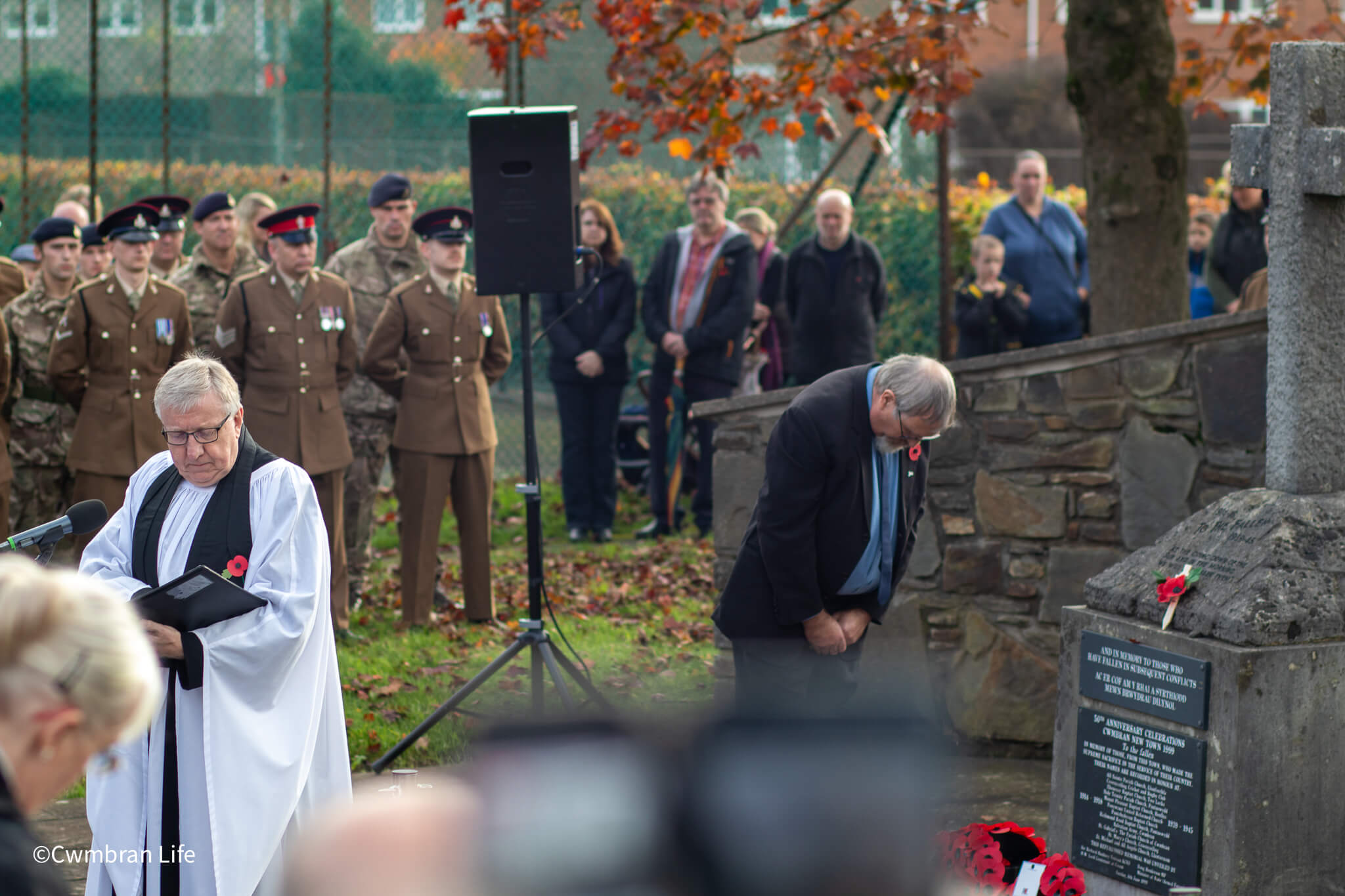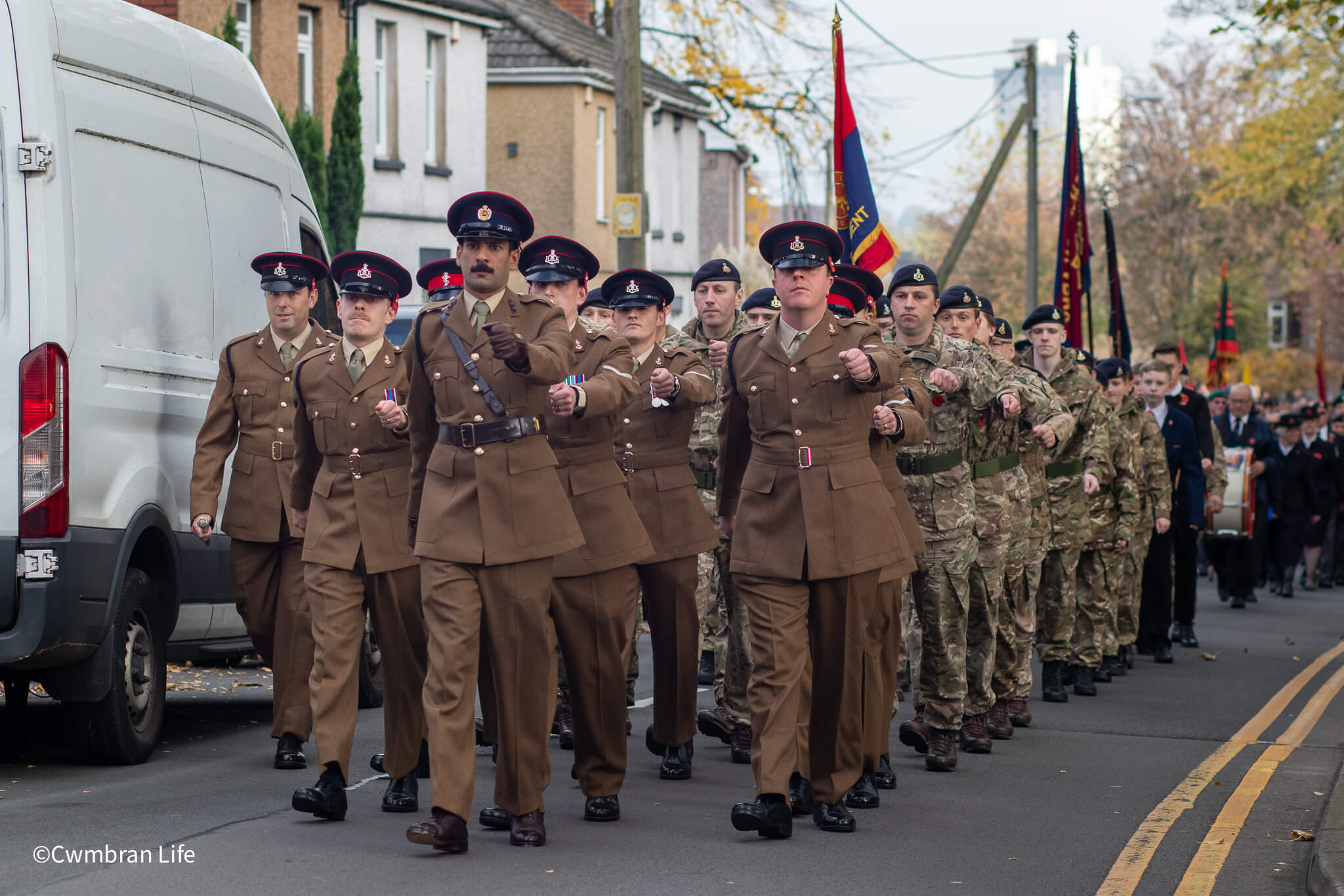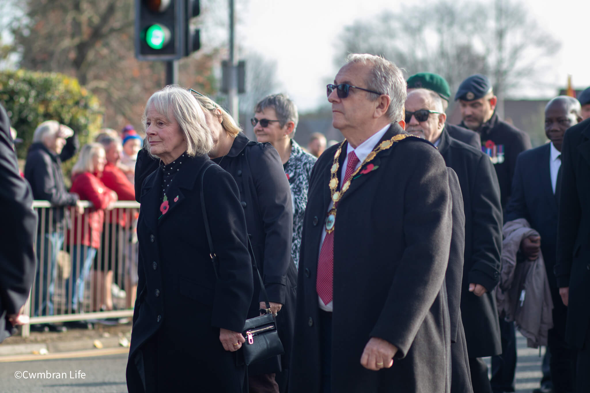 The group marched along Wesley Street to the sounds of a bagpiper and formed around the War Memorial in Cwmbran Park. Crowds stood inside the park and along Henllys Way to watch the service, prayers and laying of wreaths. The Last Post was played followed by a two-minute silence.