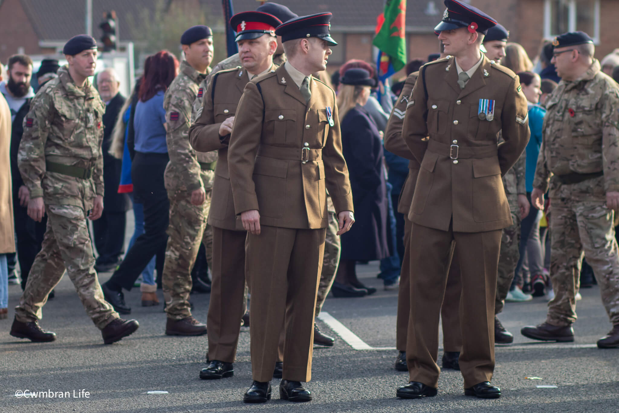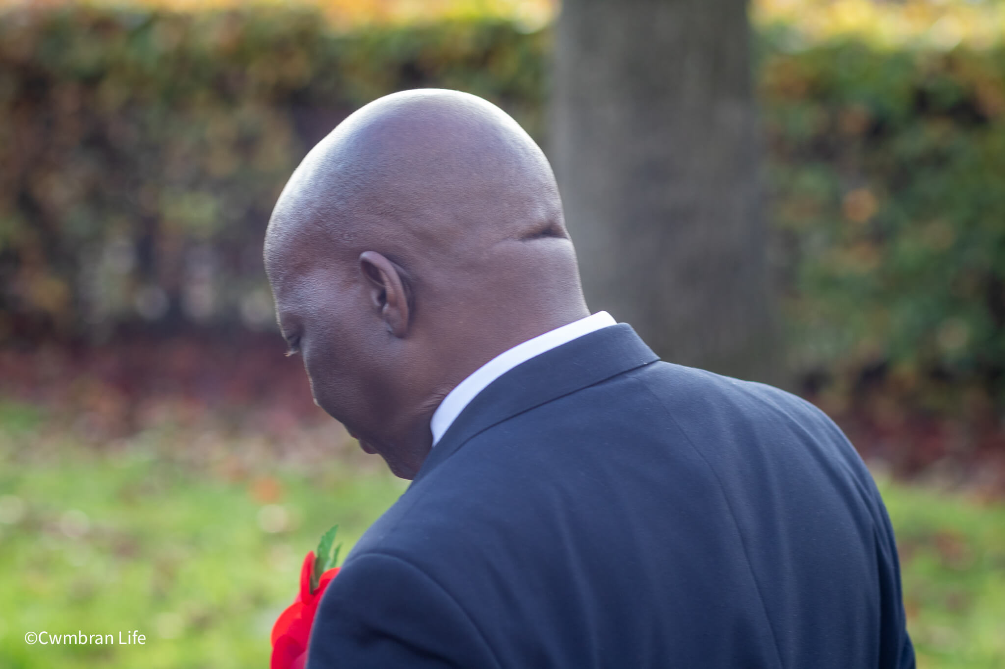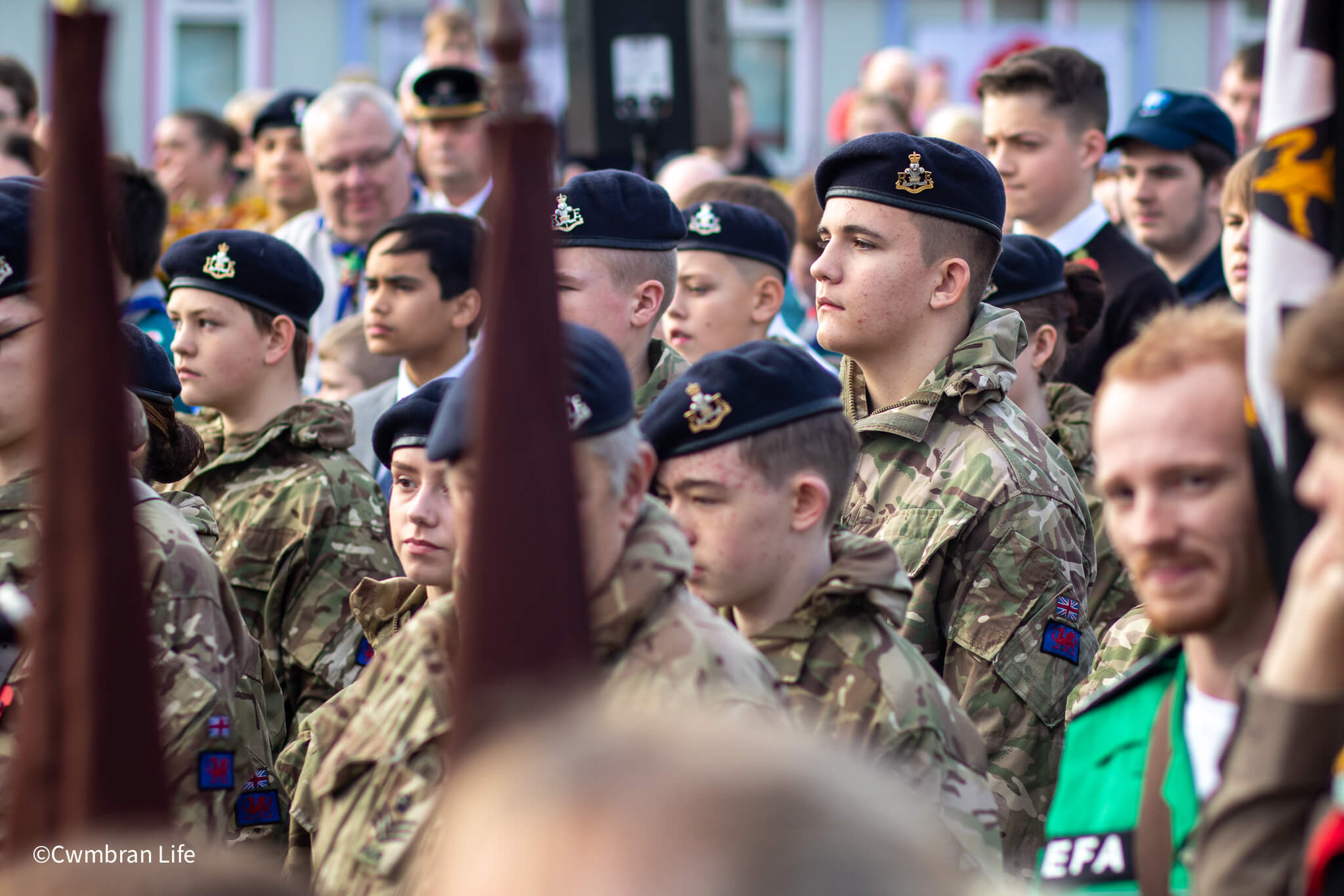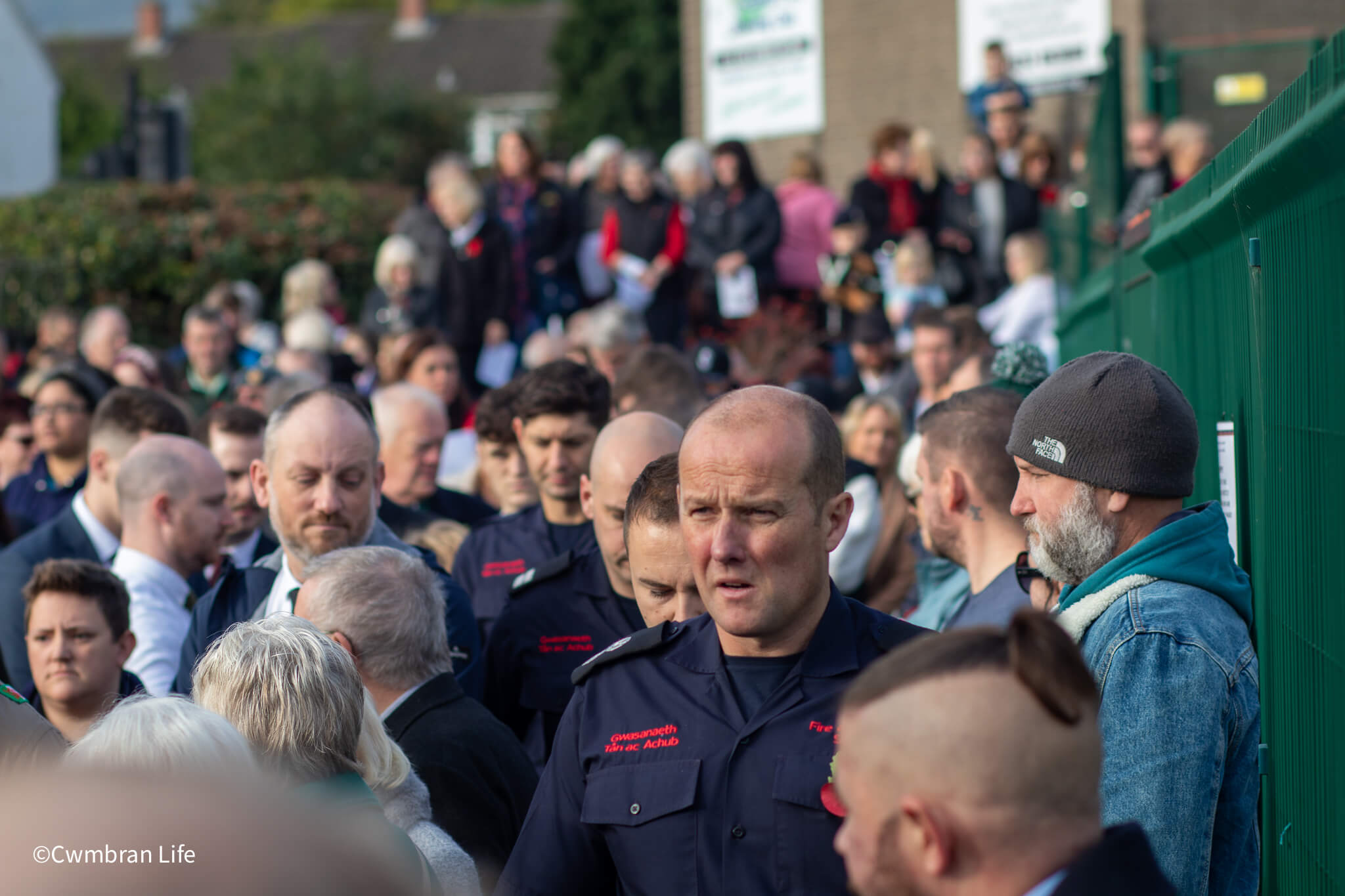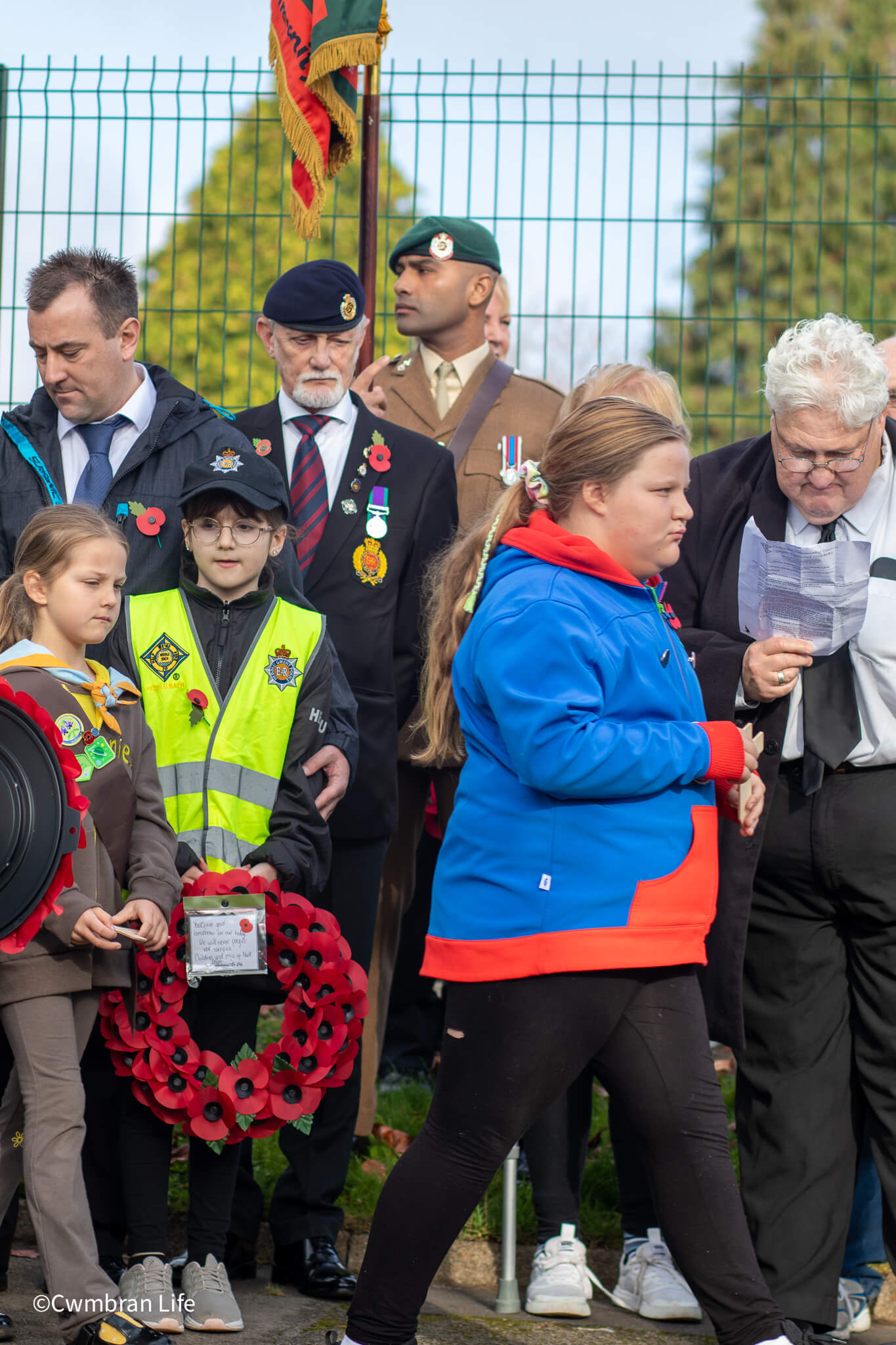The group marched along Wesley Street to the sounds of a bagpiper and formed around the War Memorial in Cwmbran Park. Crowds stood inside the park and along Henllys Way to watch the service, prayers and laying of wreaths. The Last Post was played followed by a two-minute silence.