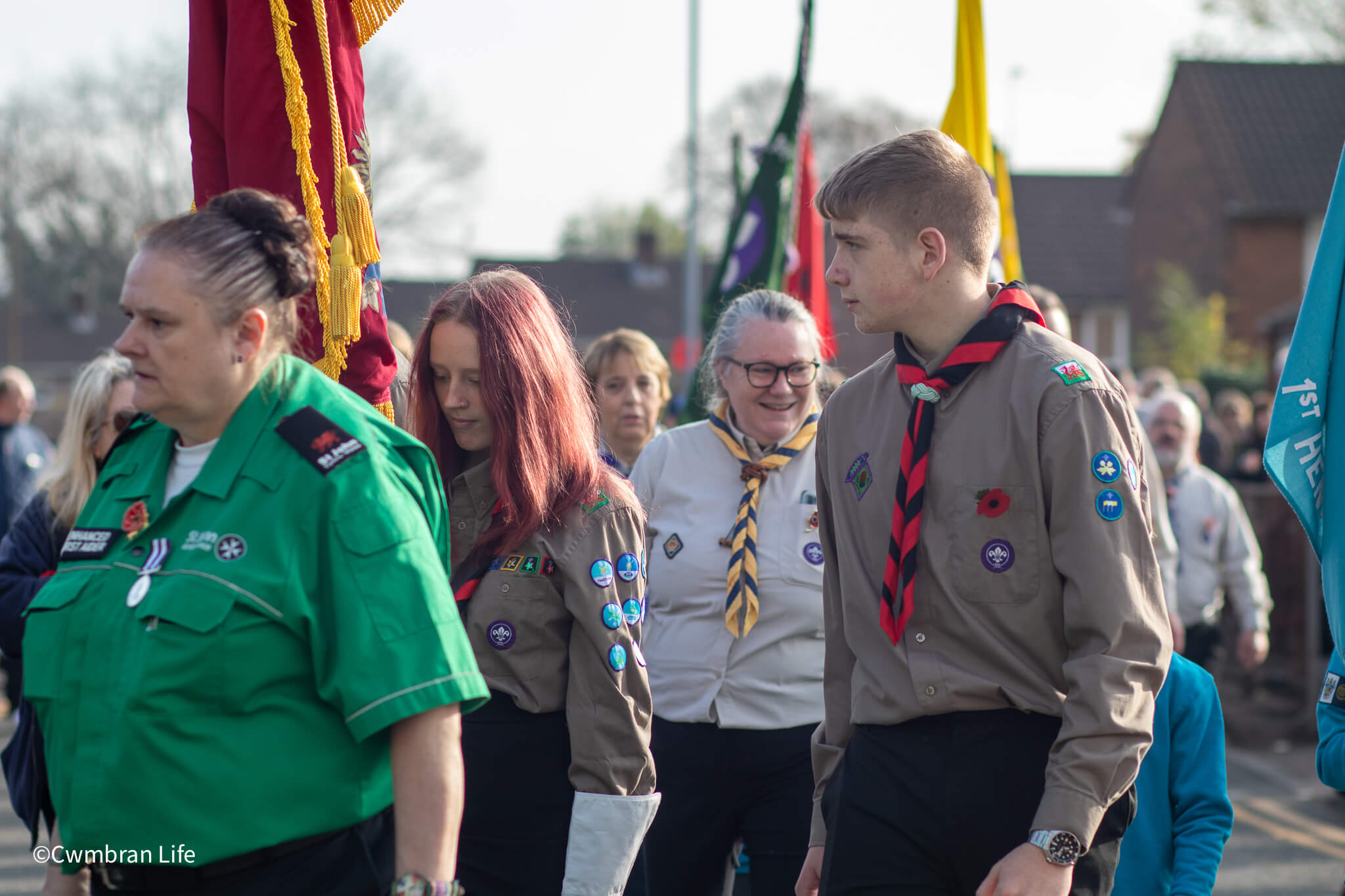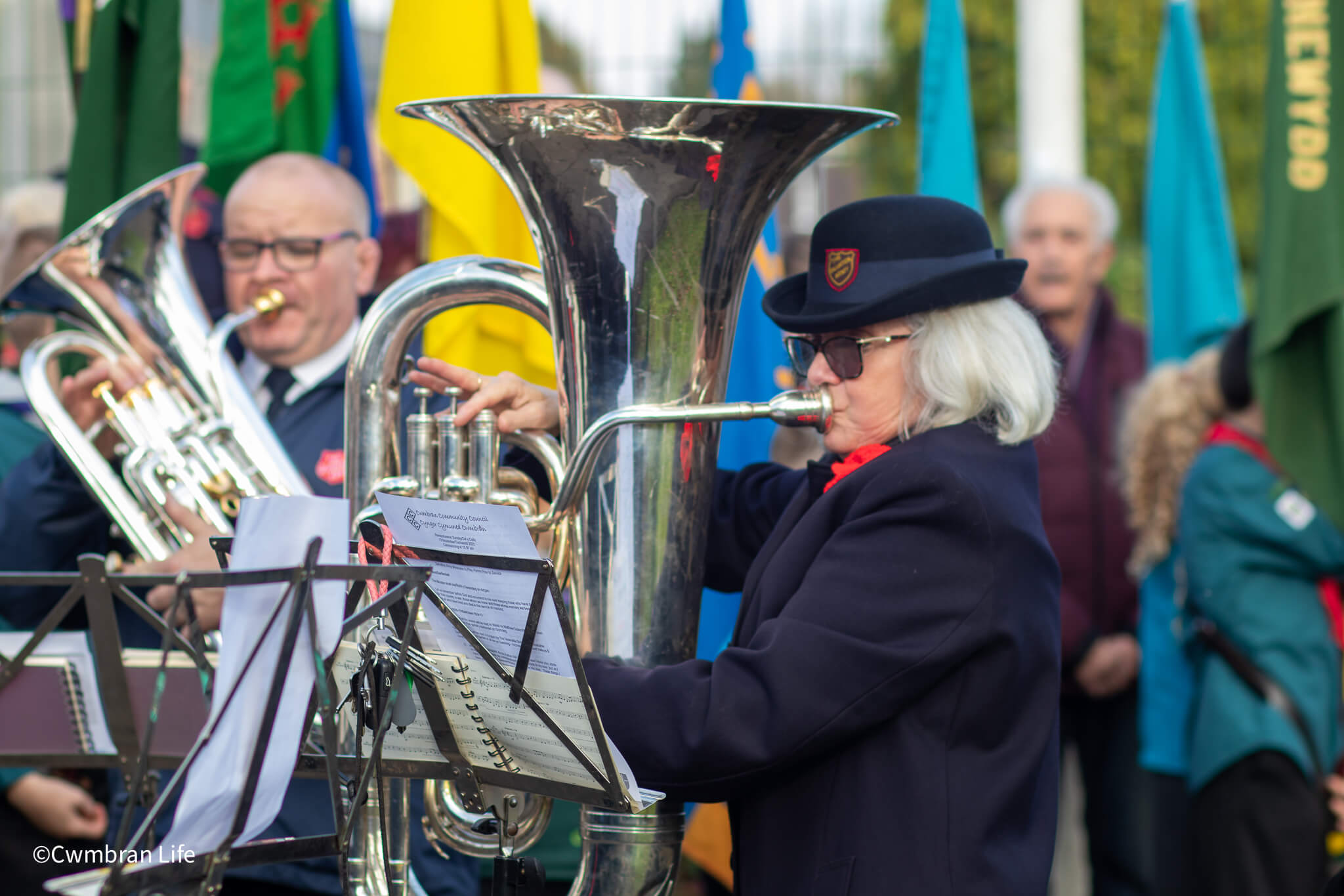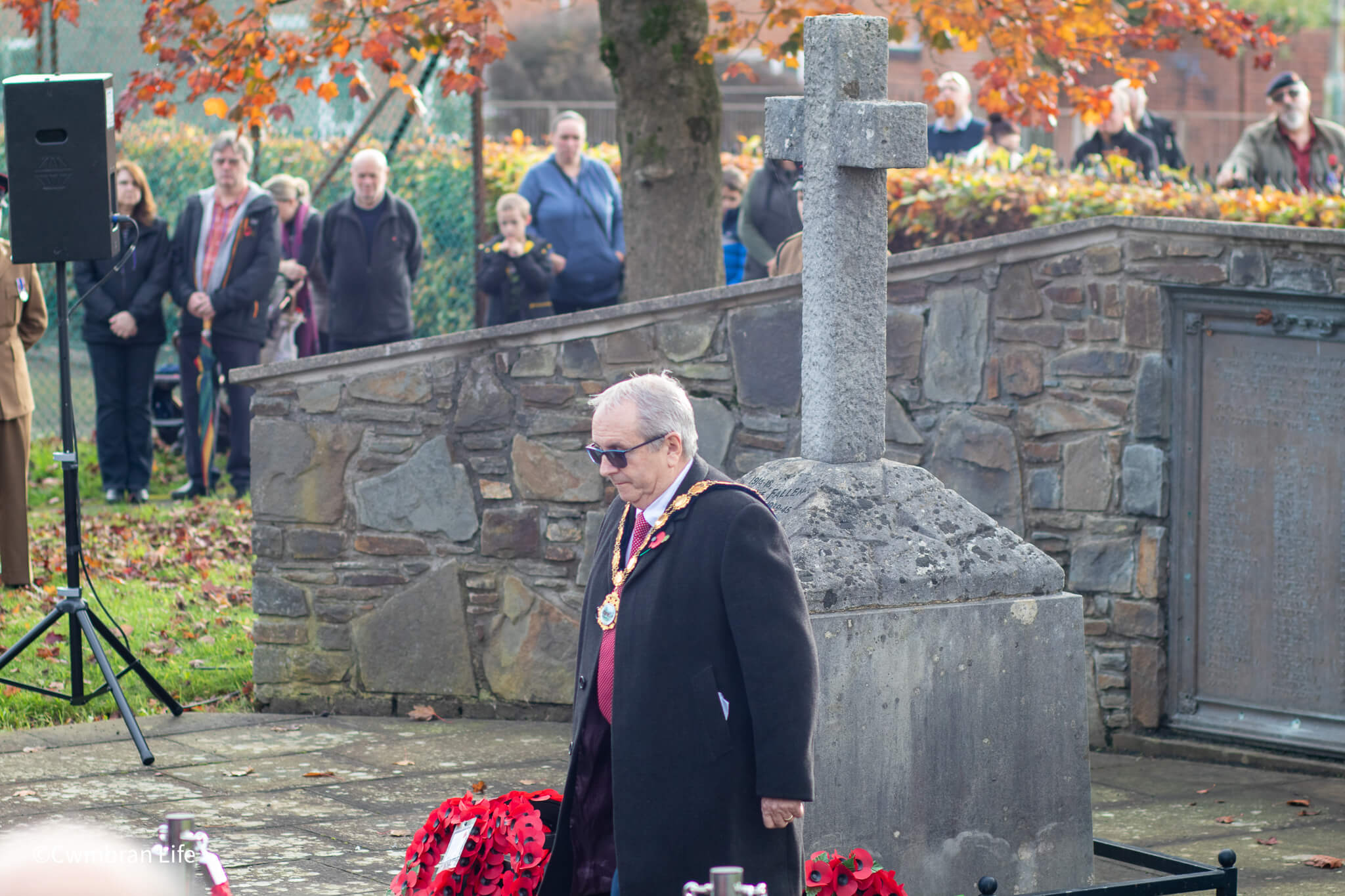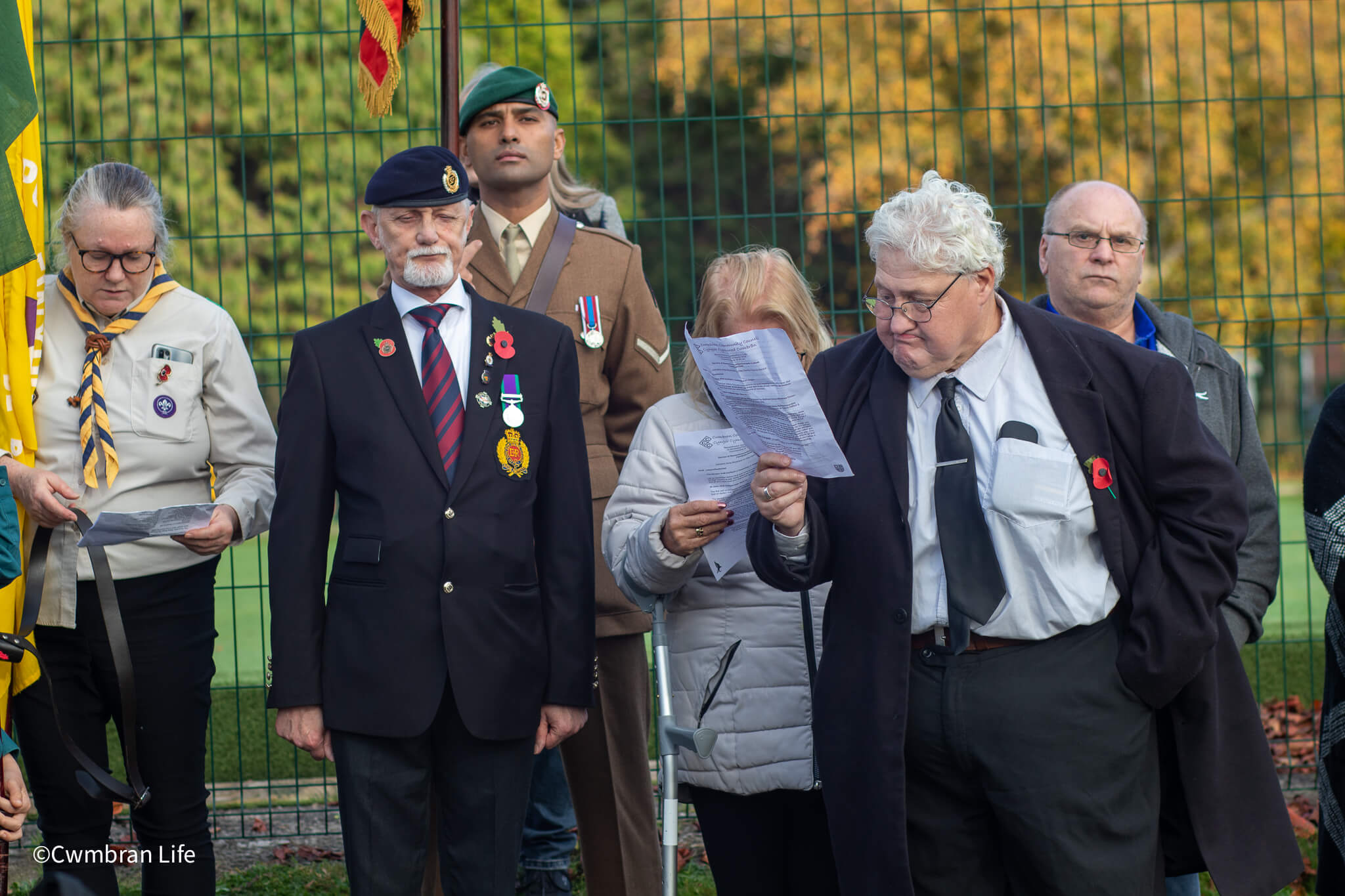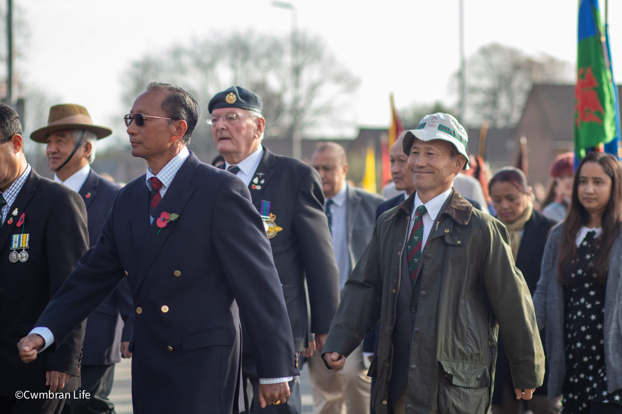 The group marched along Wesley Street to the sounds of a bagpiper and formed around the War Memorial in Cwmbran Park. Crowds stood inside the park and along Henllys Way to watch the service, prayers and laying of wreaths. The Last Post was played followed by a two-minute silence.